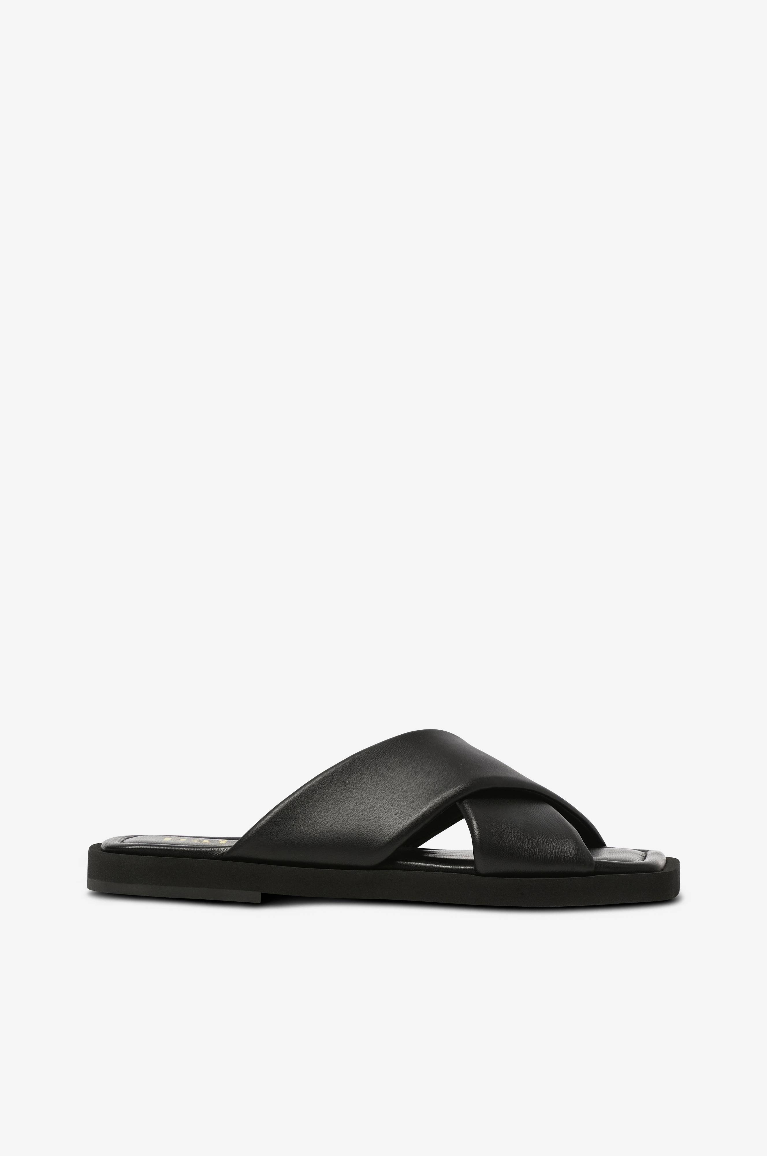 • Firkantet snude• Brede, krydsende remme i læder• Flad sål