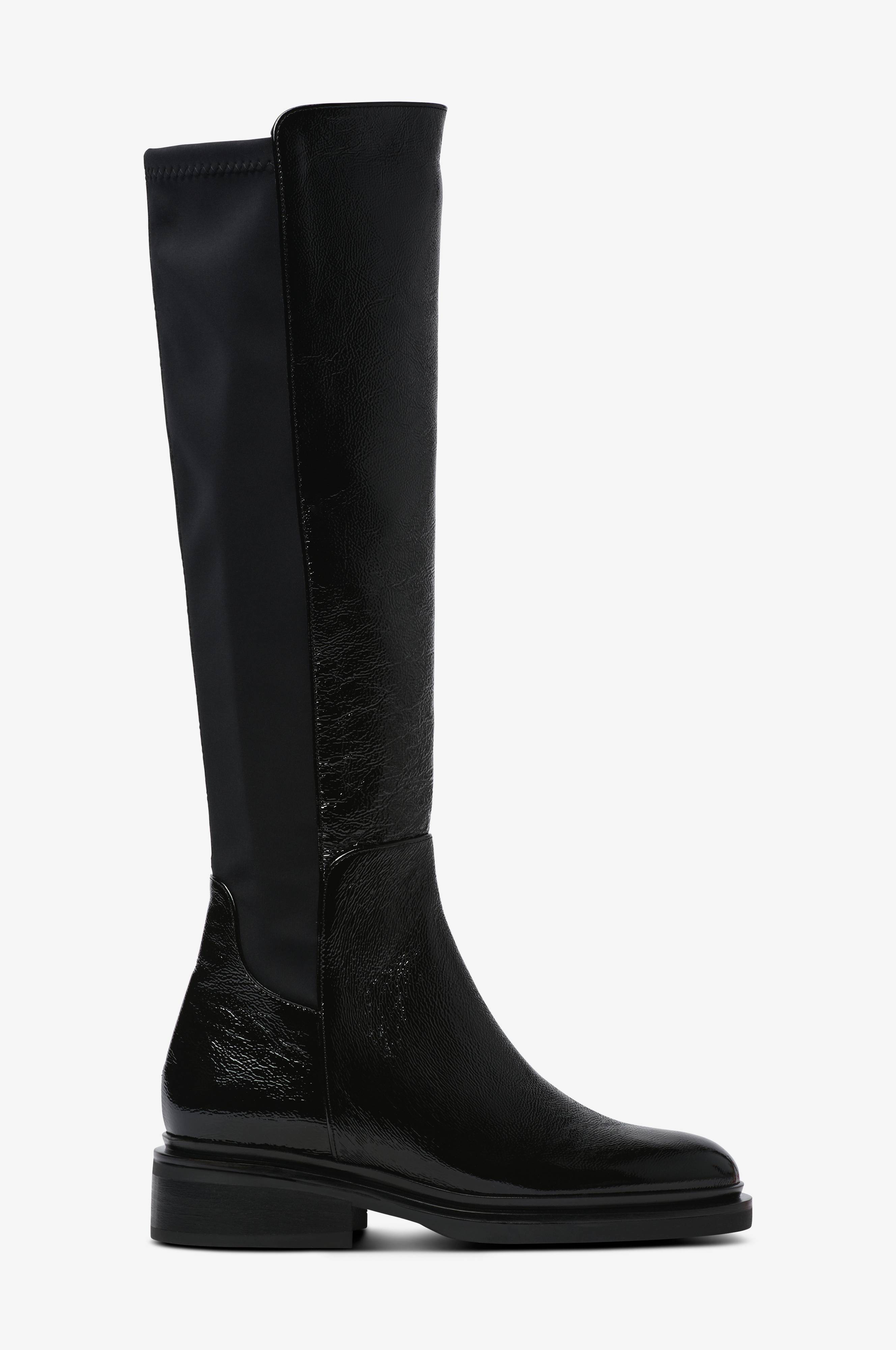 Lange støvler i lakeret skind med let struktur. Bagsiden på skaftet er i tekstil med stretch. Lynlås på skaftets inderside. For i glat skind og ydersål i gummi. Skafthøjde 44 cm i str. 37. Skaftvidde ca. 33 cm. Hælhøjde 3 cm.