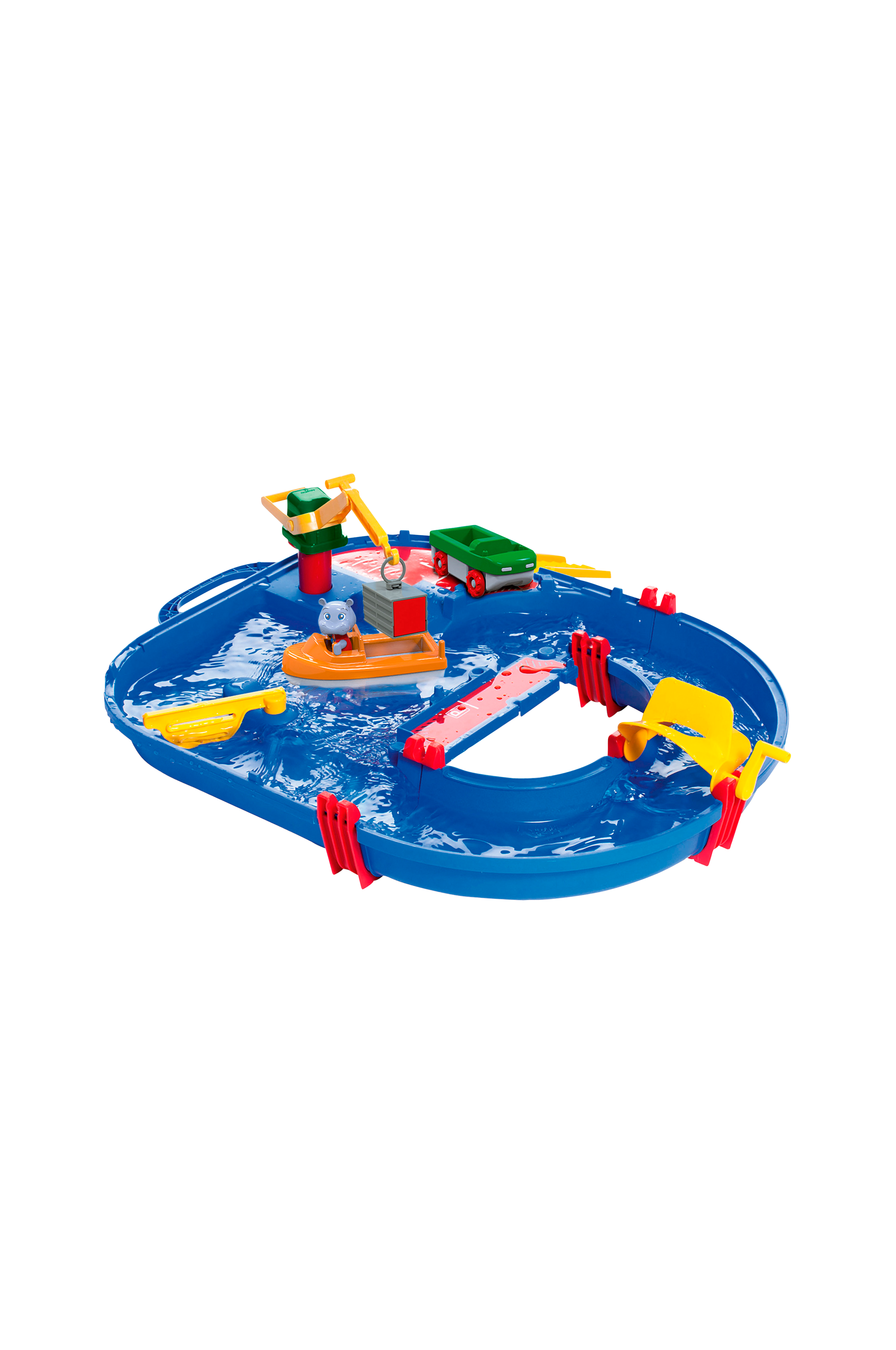 Sættet indeholder en stor havn hvor flodhesten Wilma kontrollerer kranen, så lastningen af containere til amfibiebilen og containerbåden går rigtigt til. Padlen sætter vandet i bevægelse og fører bådene fremad gennem kanalerne - en spændende måde at lære om vandets bevægelser! Aquaplay er modulopbygget og man kan naturligvis kombinere startsættet med andre Aquaplay-sæt og udbygningsdele.