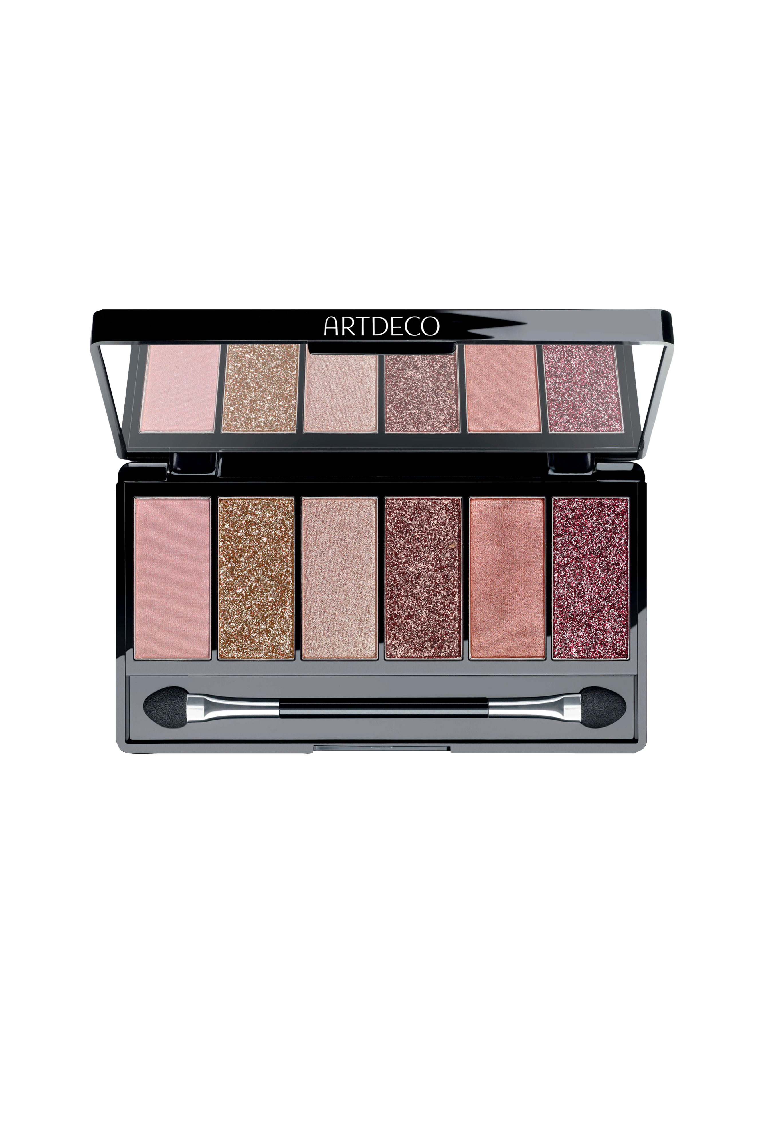 Glittery Eyeshadow Palette er en limited edition øjenskyggepalette bestående af seks øjenskygger - tre perlemorsnuancer og tre glitternuancer - som du kan bruge til at skabe dramatiske smokey eyes og virkelig glitrende festlooks. Pudderskyggerne har en behagelig blød tekstur og har en cremet, silkeagtig finish på huden. Alle nuancer giver rig farve, intens dækning og er smukt lysreflekterende. Der medfølger et spejl og en praktisk dobbelt applikator.