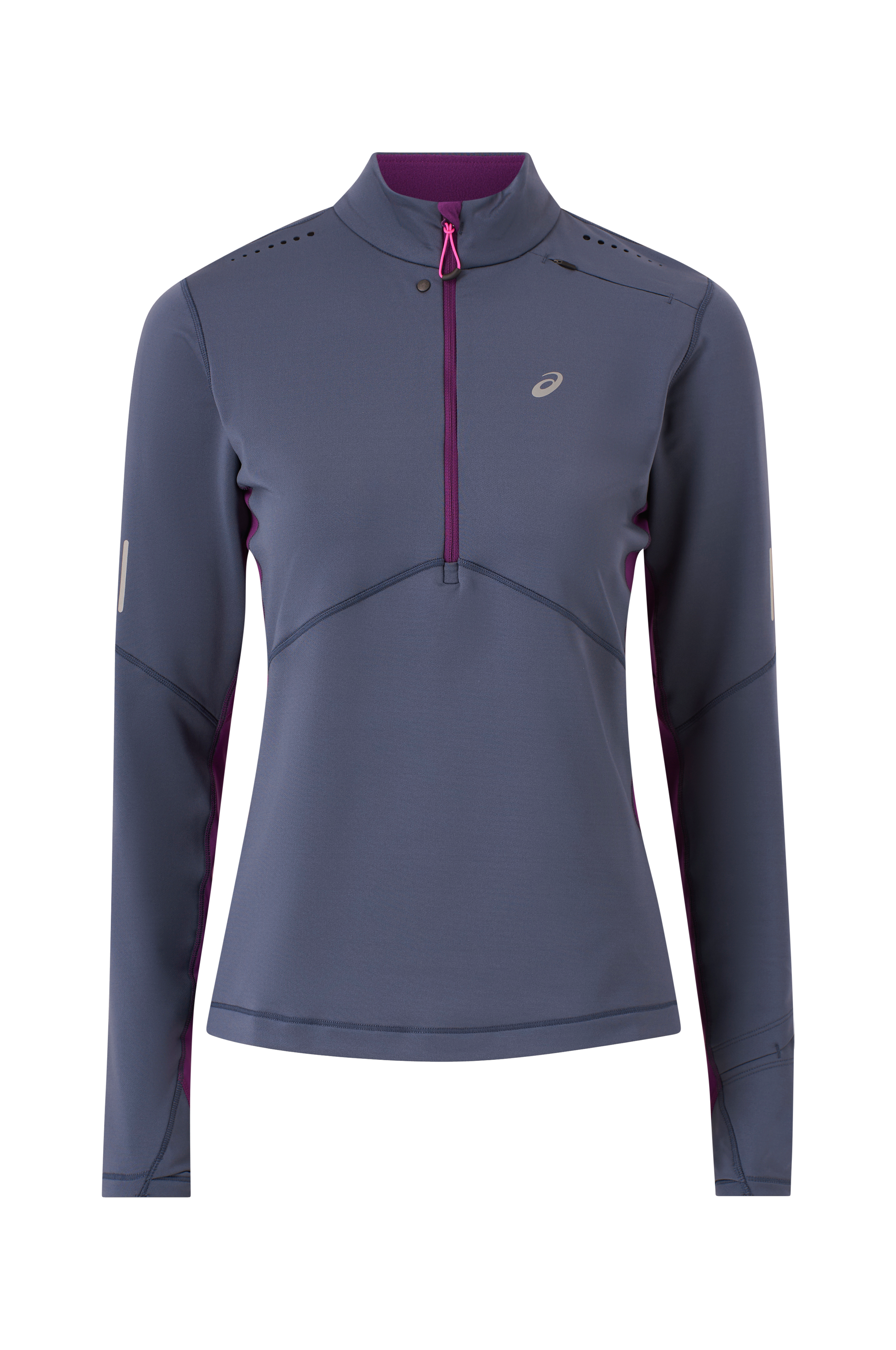 • Lille opretstående krave• Lynlås• Tommelfingerhul ved manchetterne• Svedtransporterende, ventilerende materiale• Ventilerende perforering på skuldrene• Reflekterende detaljer