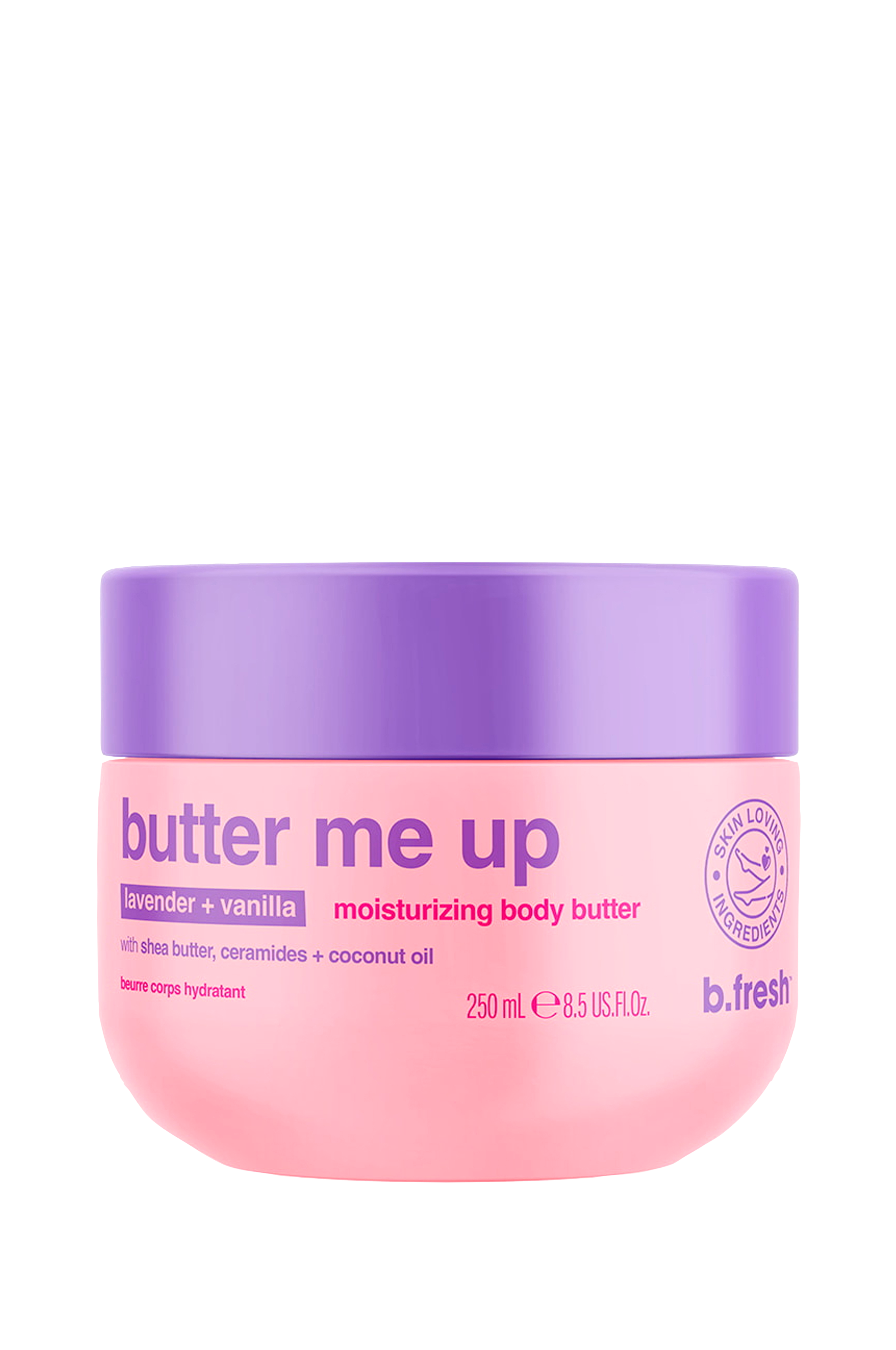Butter Me Up - Moisturizing Body Butter er en fugtgivende og opstrammende bodylotion, der gør huden ekstra blød. Beriget med sheasmør for at holde på fugten, samt ceramider og kokosolie for ekstra fugt, samtidig med at den nærer og forbedrer hudens tone og struktur. Den har en beroligende duft af lavendel og vanilje og er vegansk.