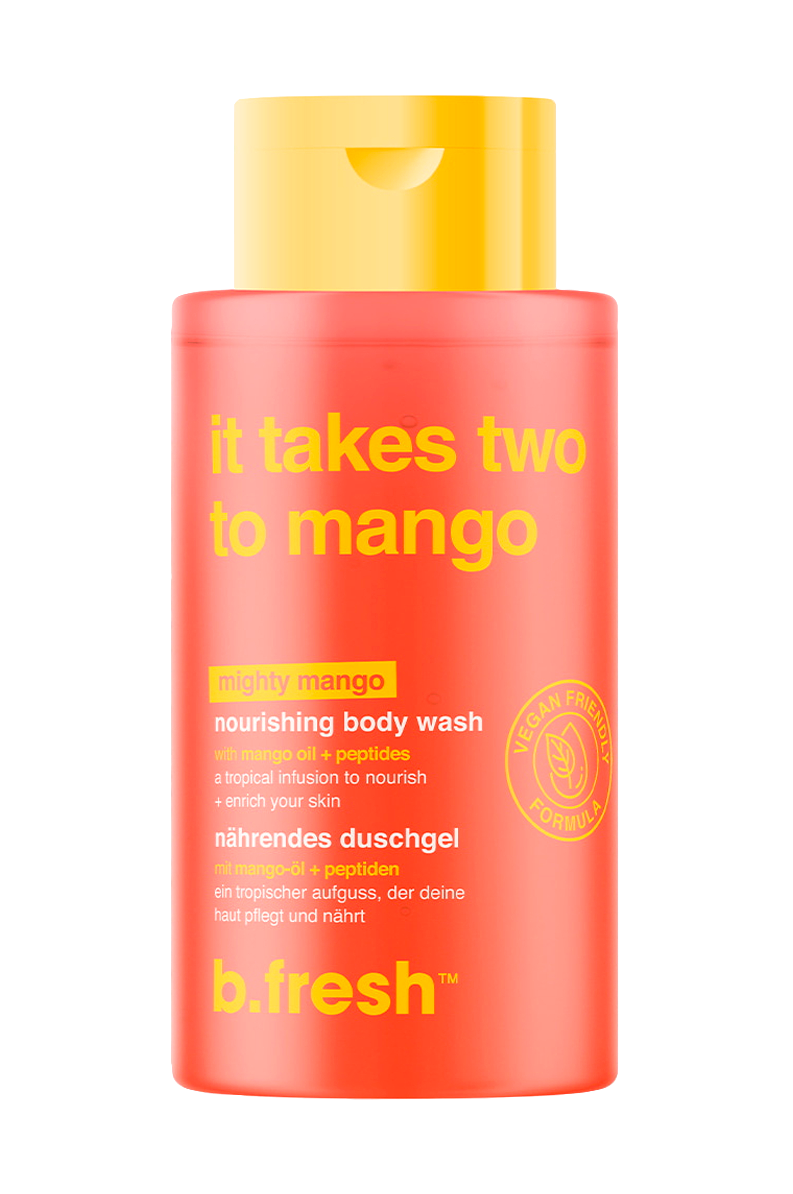 It Takes Two To Mango - Nourishing Body Wash er en plejende shower gel, der fugter i dybden og efterlader huden blød med en lækker fløjlsagtig fornemmelse. Den nærer huden, mens den renser og holder den smukt duftende. Beriget med peptider, der hjælper med at forbedre hudens struktur og glathed, samt eksotisk mangoolie, der giver dyb hydrering og blødhed. Showergelen har en tropisk mangoduft, er vegansk og fri for parabener og alkohol.