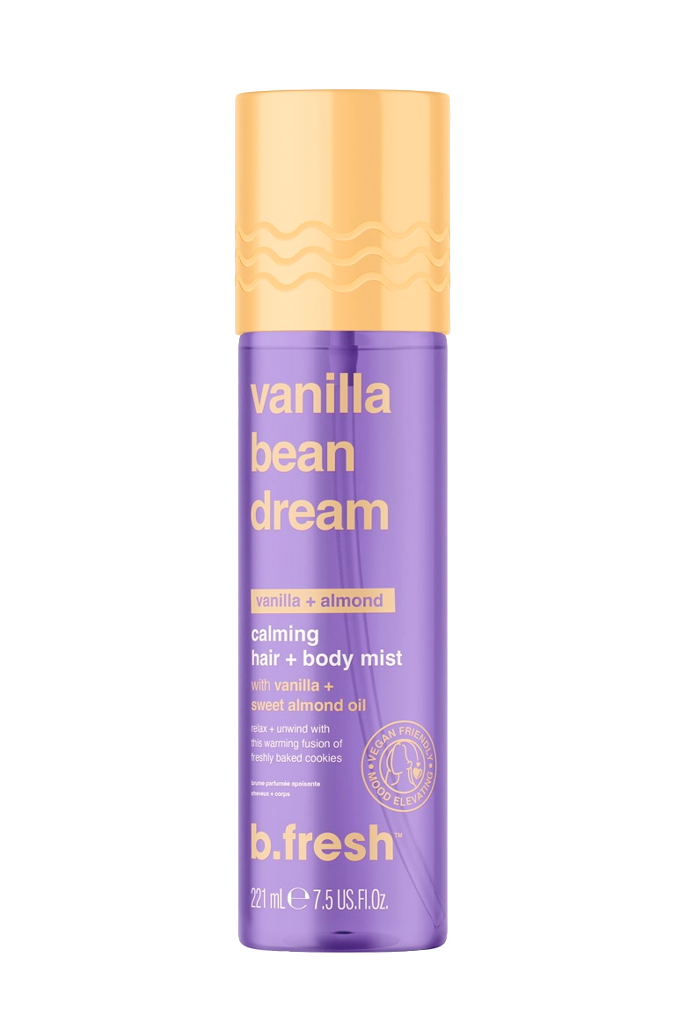 Vanilla Bean Dream - Calming Hair + Body Mist er en hår- og kropsspray med en hyggelig, varm og afslappende duft af nybagte småkager. Misten er vegansk og fri for parabener og sulfater.
