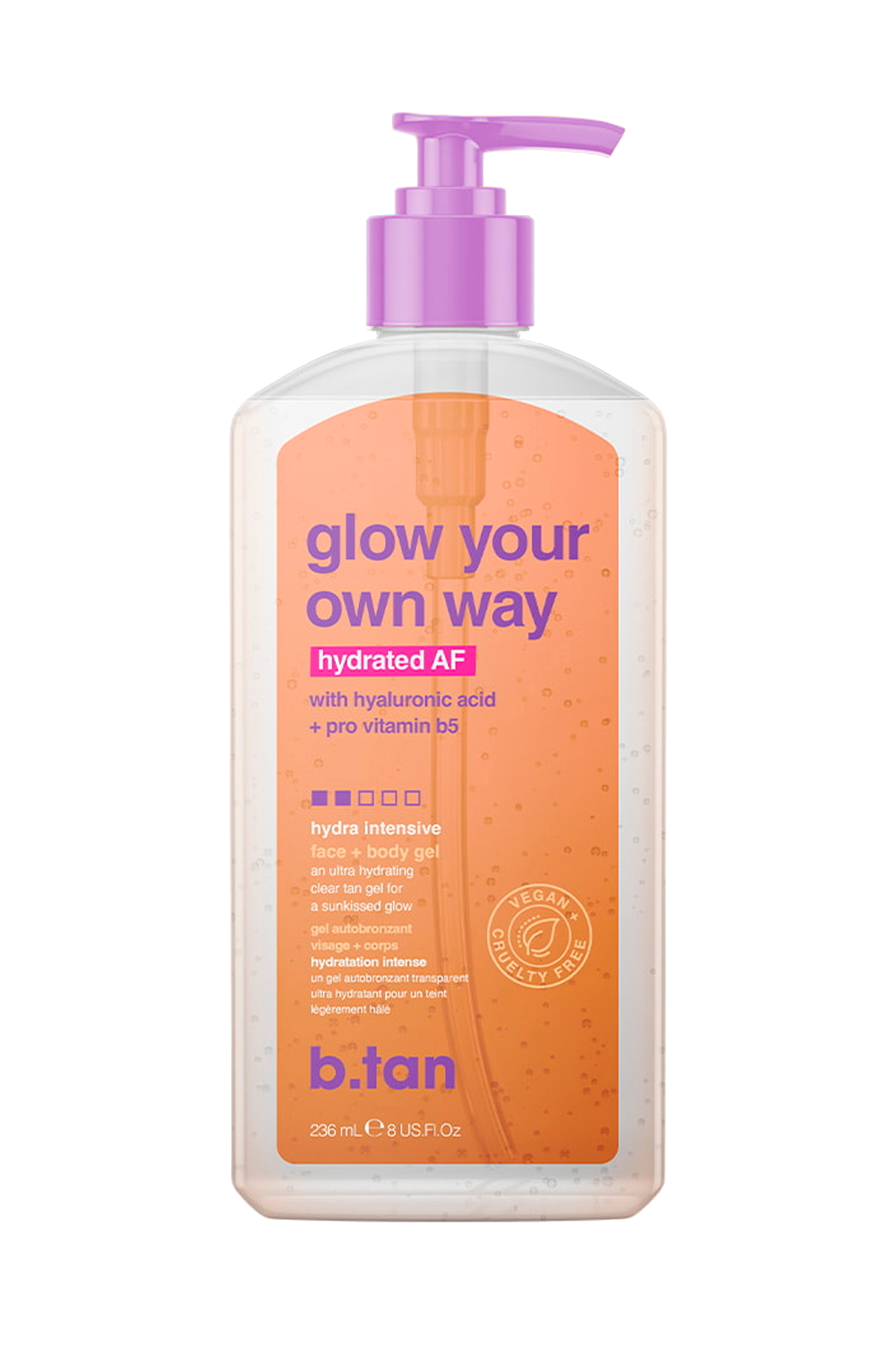Glow Your Own Way Hydrated Af - Face + Body Self Tan Gel er en transparent og mørk selvbruner i geléform til ansigt og krop. Gelen er ekstra fugtgivende for en blød hud, mens den gradvist opbygger en strålende og naturlig kulør. Beriget med kraftig hyaluronsyre og provitamin B5, der giver en fantastisk glød. Den gennemsigtige, overførselsresistente gel skal ikke skylles af. Den er fri for rod, 100 % vegansk og fri for parabener.