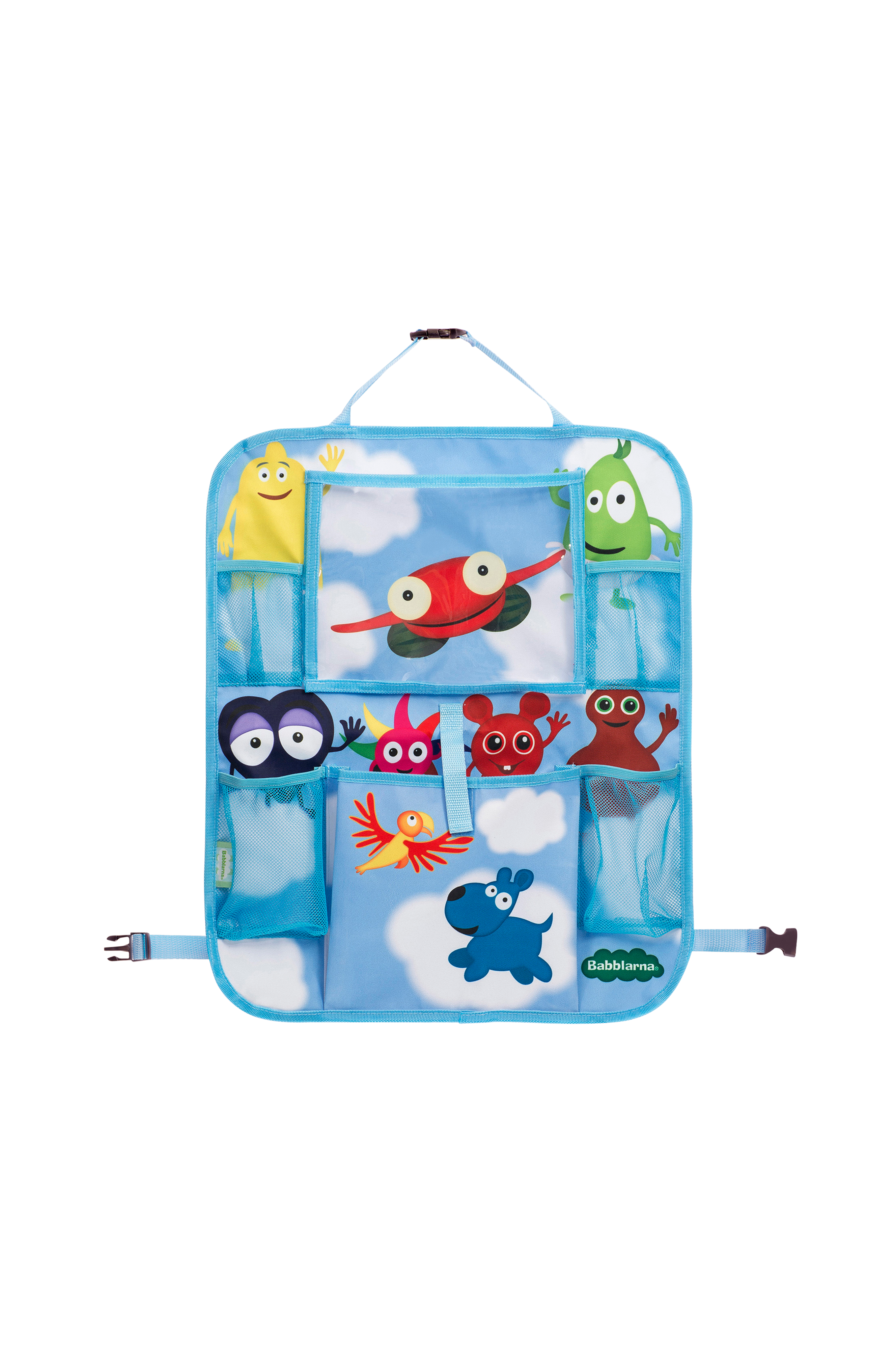 Praktisk aktivitetslomme med opbevaringsrum til biler. 5 lommer til eksempelvis legetøj og lomme til tablet.