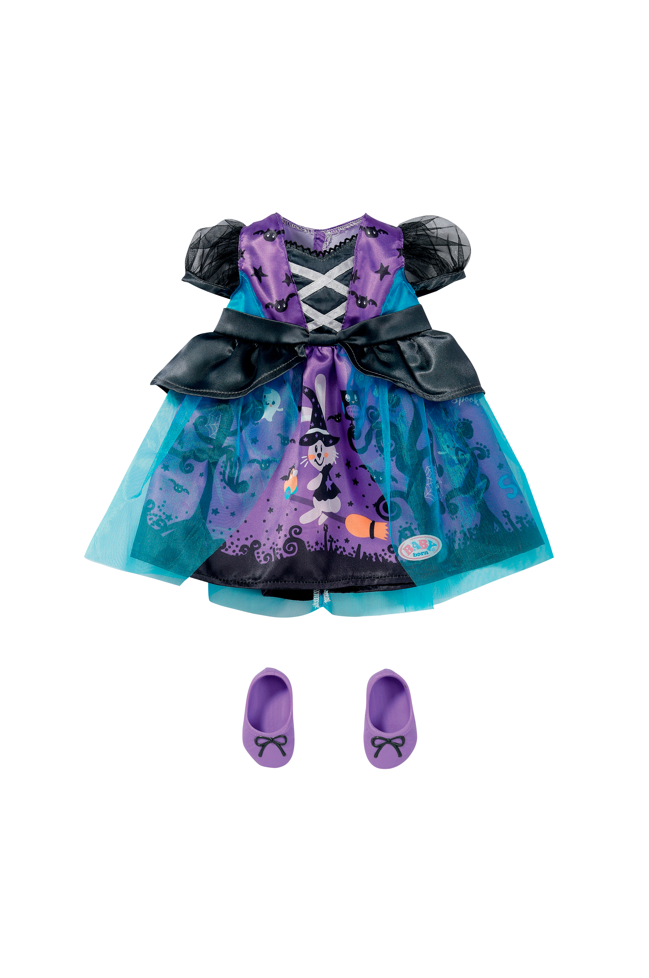 "Buuuuu" klæd din dukke i en kjole i nattens farver - blå tyl med sorte detaljer på tylærmerne, korsetsnøring på brystet og på overskørtet. Desuden er den lille heksedukke iført lilla ballerinasko.