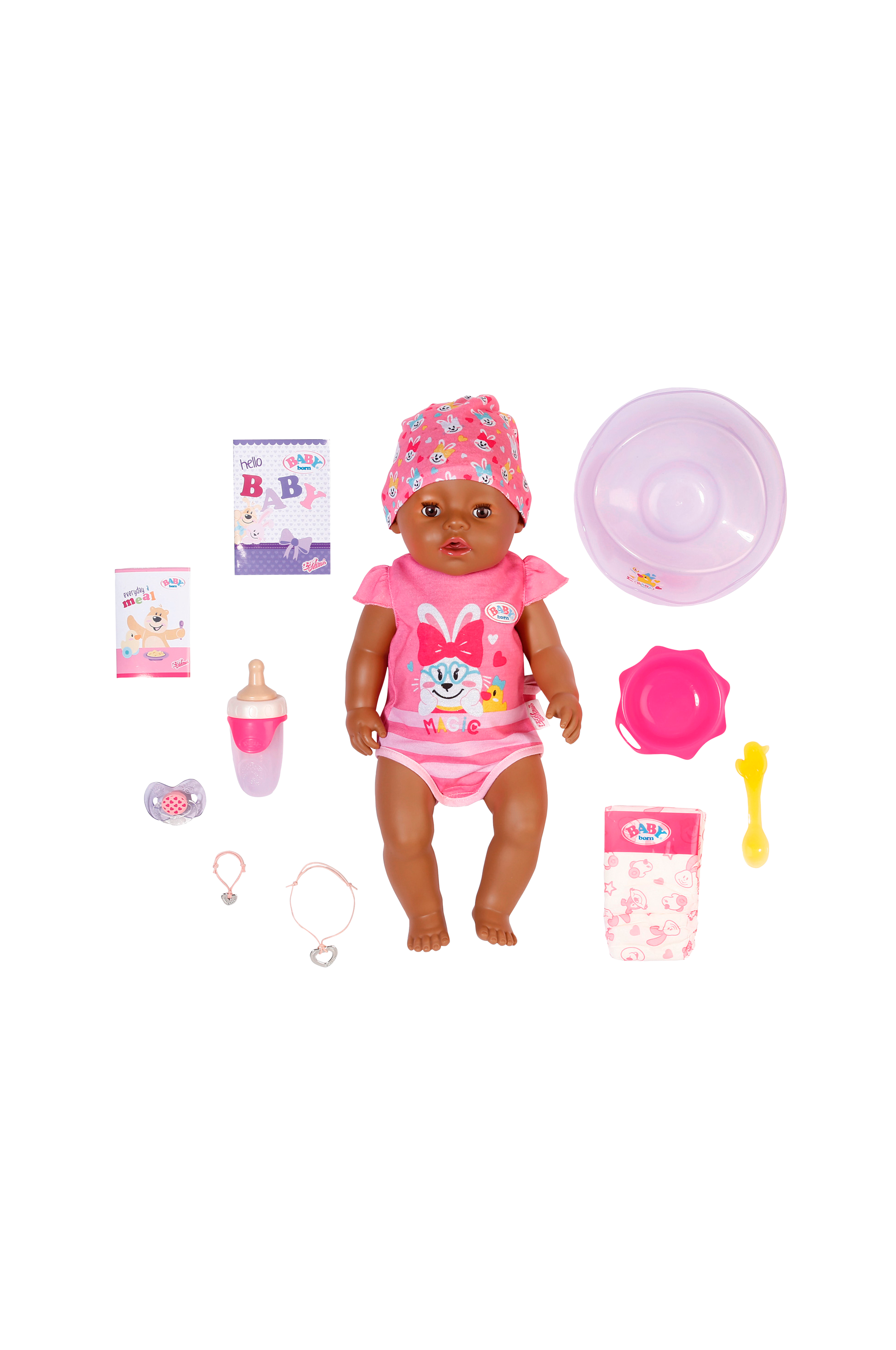 Den lille pige har også sovende øjne: Hvis du lægger hende på ryggen uden sin sut, lukker hun automatisk øjnene. Hendes yndlingsbeskæftigelser er at sove, spise og bade. Hun elsker at drikke vand fra sin flaske. Så kan hun tisse i bleen eller potten og græde rigtige tårer. Foruden drikkevand kan BABY born også spise grød. Og hun kan også lave pøller. Hendes arme, ben og hoved er ekstremt mobile, så det er en ren barneleg at give hende det flotte tøj på og tage det af igen. Soft Touch-kroppen er blød og herlig.