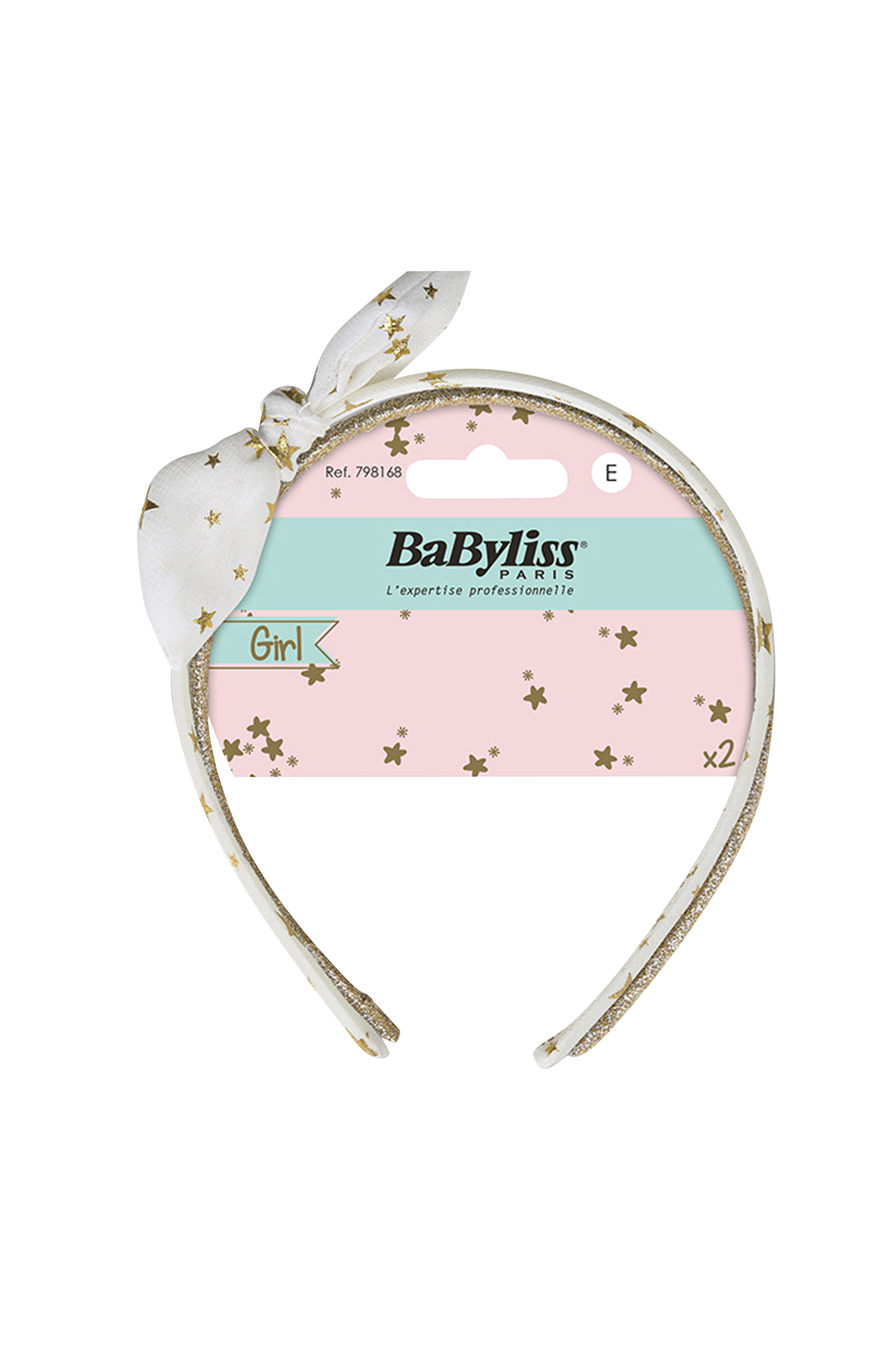 2-pak hårbøjle til børn. En hårbøjle er guldglitrende og en er klædt i hvidt, tyndt stof med små guldstjerner.