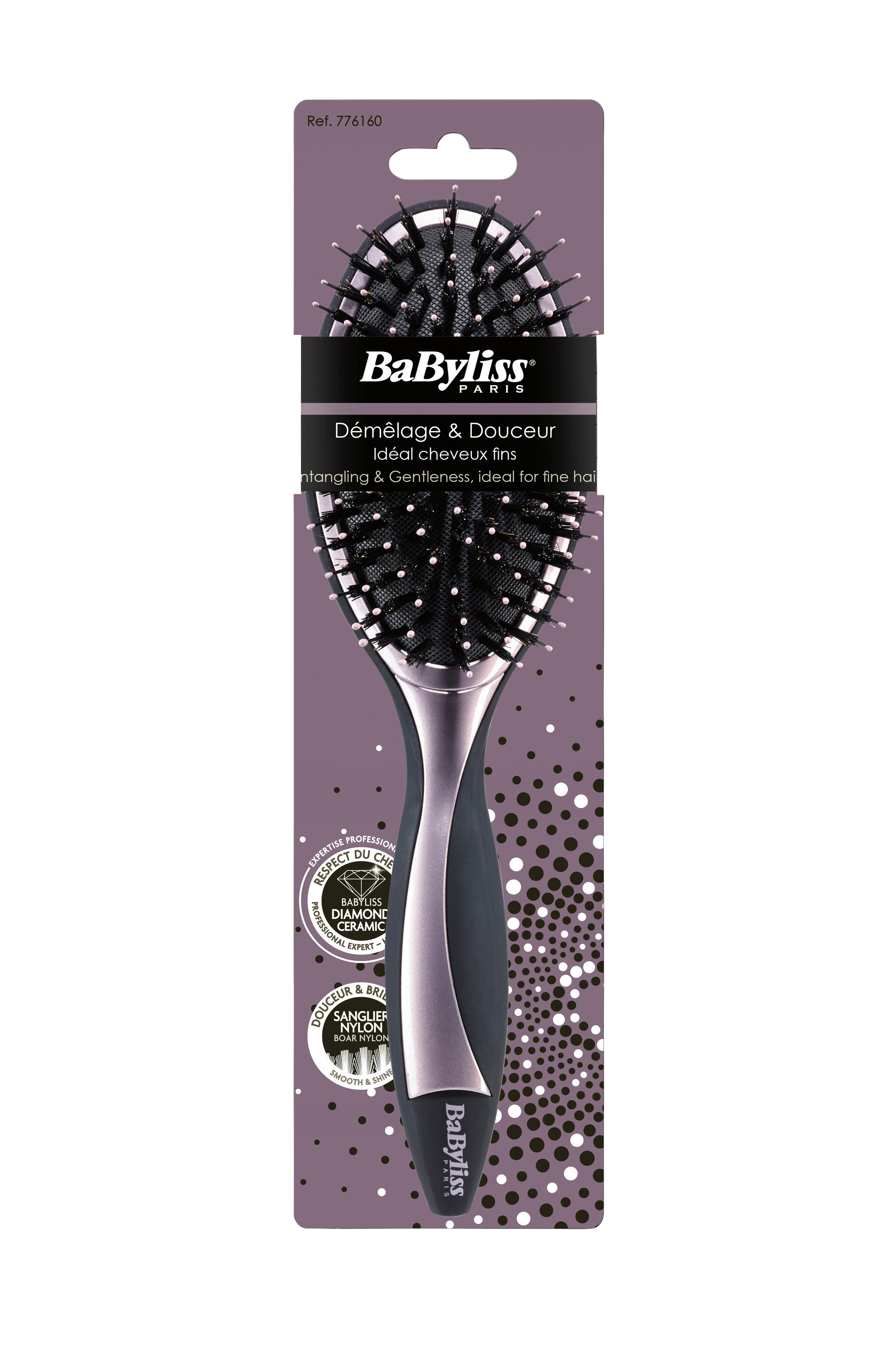 Eksklusiv udredningsbørste fra The Diamond Ceramic Range. Til udredning og komfort. Passer til lidt finere hår. Børste af vildsvinehår og polyamid. Den keramiske overflade giver håret maksimal glans og minimal slitage. Børsten har en eksklusiv, lillaskinnende overflade.