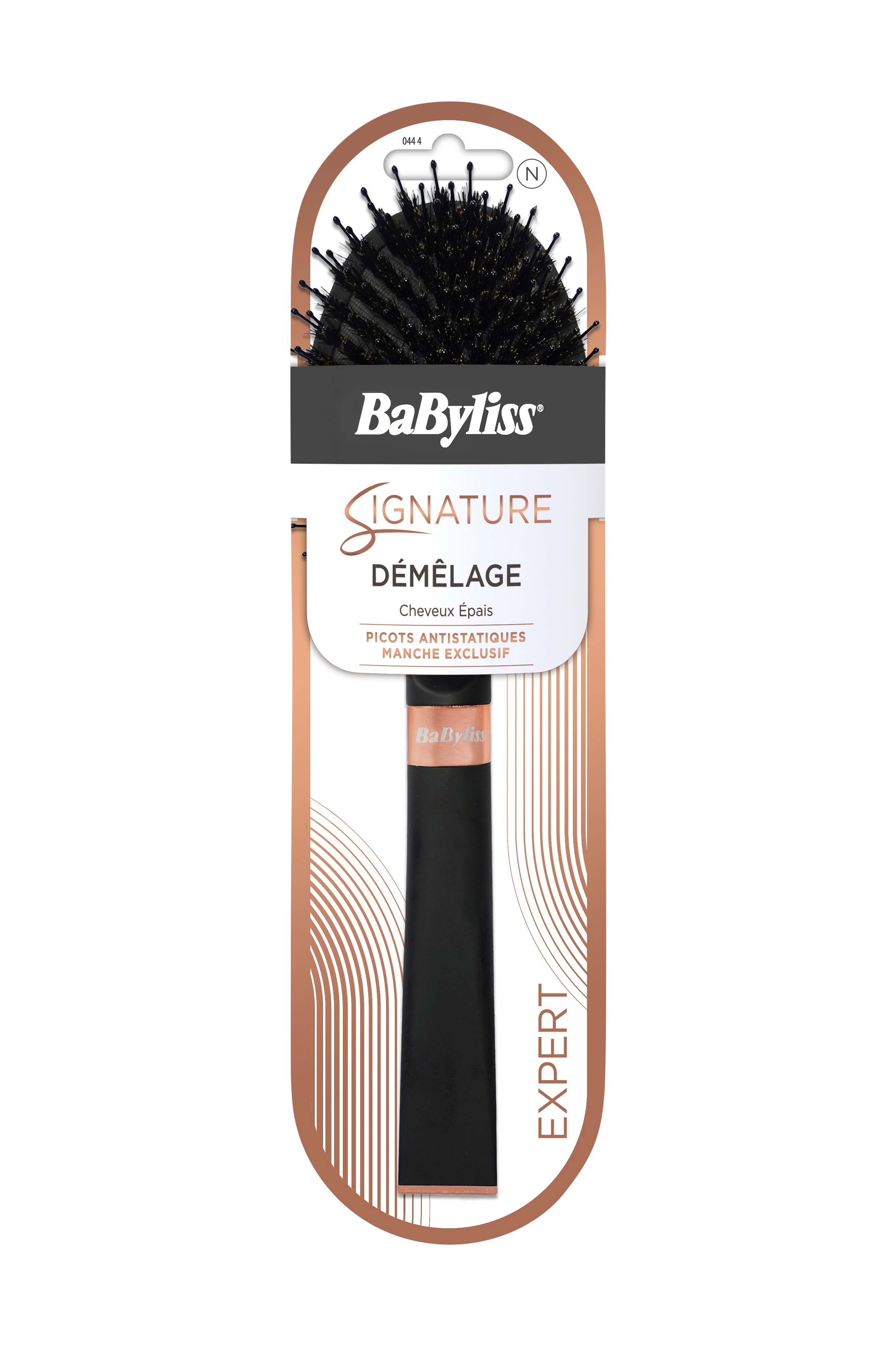 En eksklusiv, undersøgende padlebørste med vildsvinehår og nylonhår. Vildsvinehår løsner blidt håret og giver det glans. Nylonpigge reder håret ud i dybden. Ionbehandlede børstehår til antistatisk børstning. Håret lægger sig blødt ned uden løse hår. For tykt hår. Eksklusivt soft touch-håndtag. Flad bund - kan stå. Detaljer om kobber.