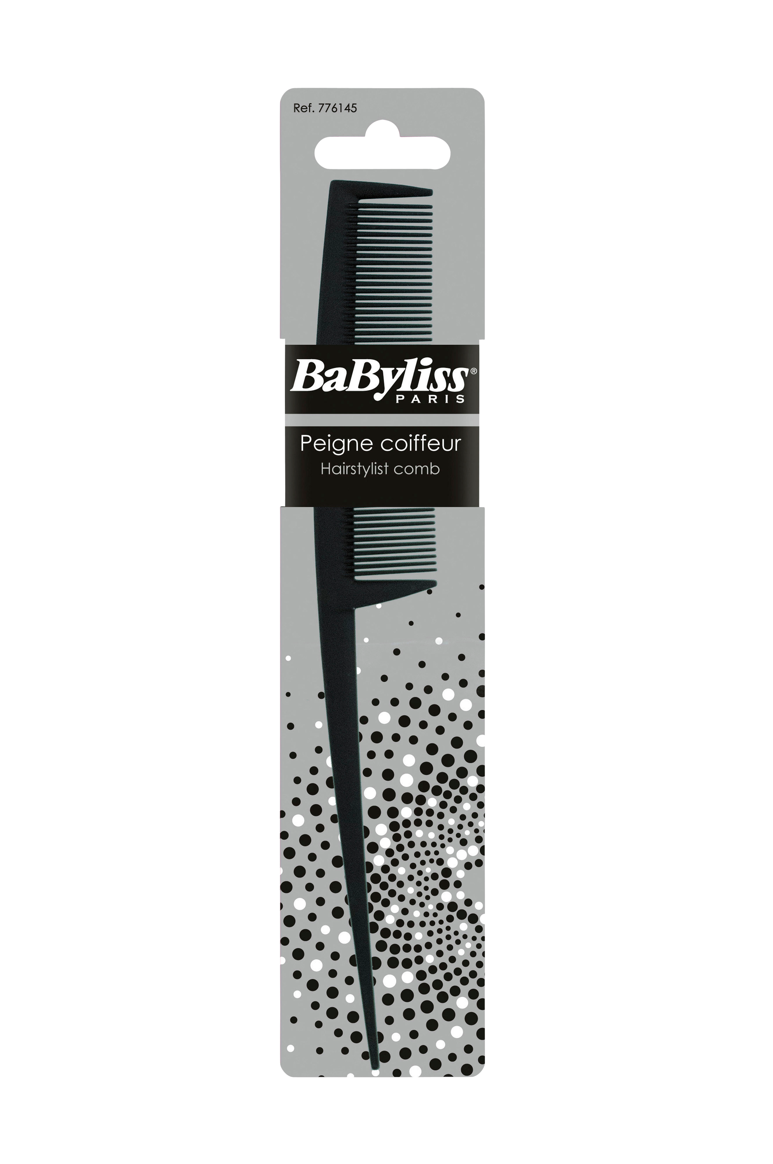 Denne kam med skaft er et uundværligt præcisionsværktøj til at opdele håret i løkker eller korrigere frisuren ved styling, opsætning osv. De tætte tænder gør det nemt at påføre farve. Sort.