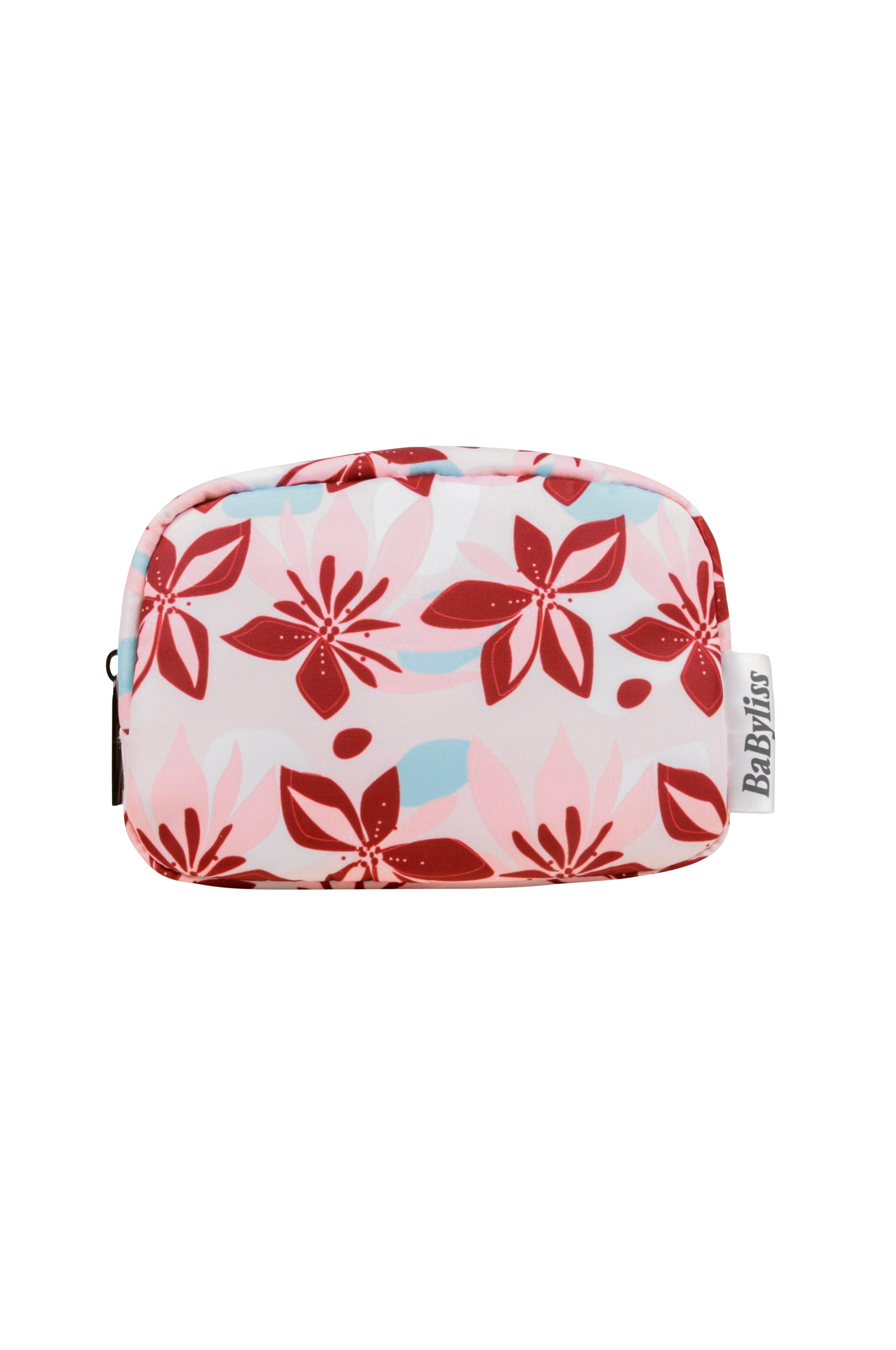 Toilettaske med tropisk blomstermønster i rosa, grøn, hvid og lyseblå på grøn bund. Let at rengøre.B27xH16xD7 cm