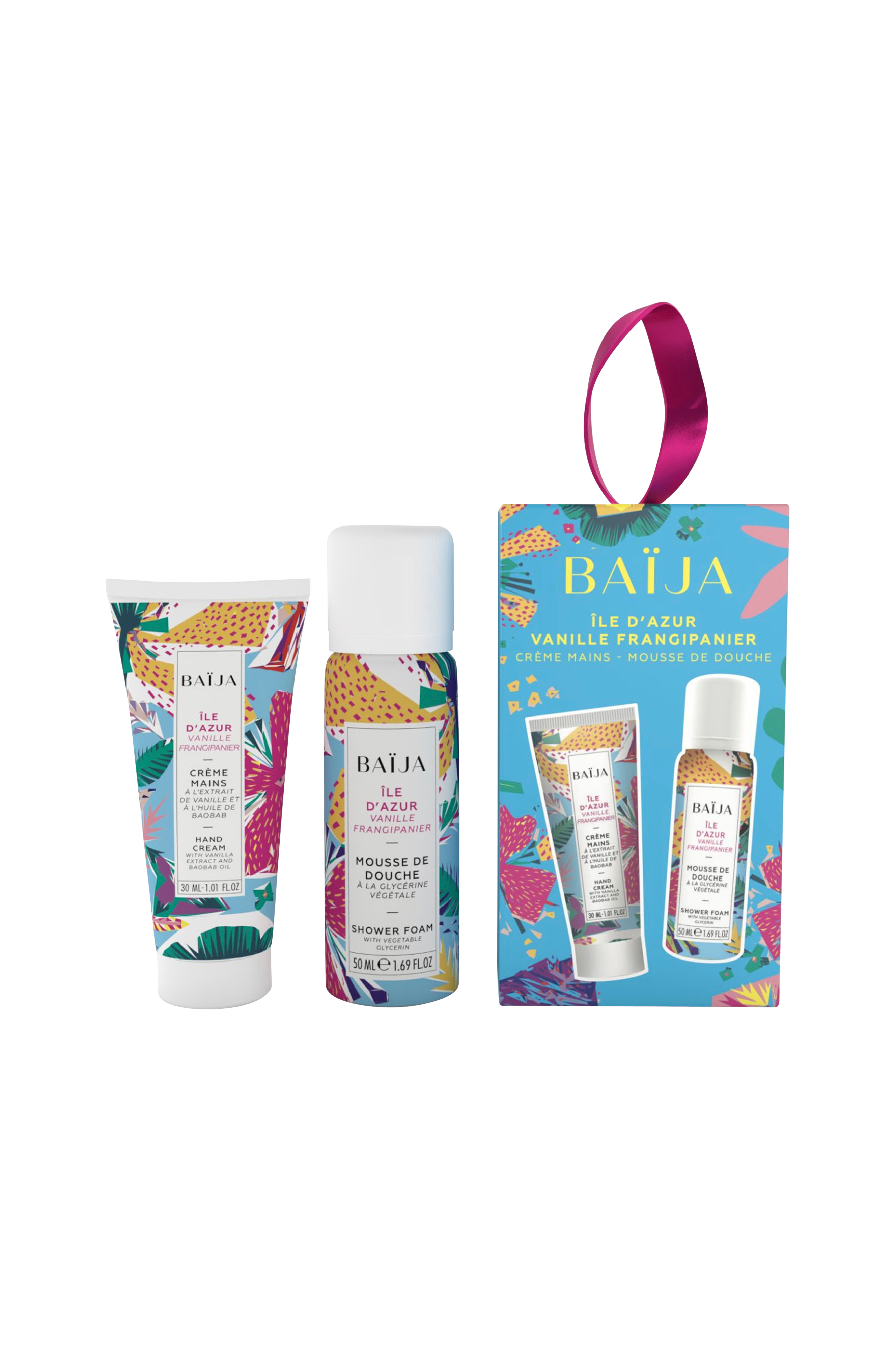 Duo af en hand creme med baobabolie og en cremet shower skum med duft af vanilje og frangipaniblomst, tag til øen Madagaskar.