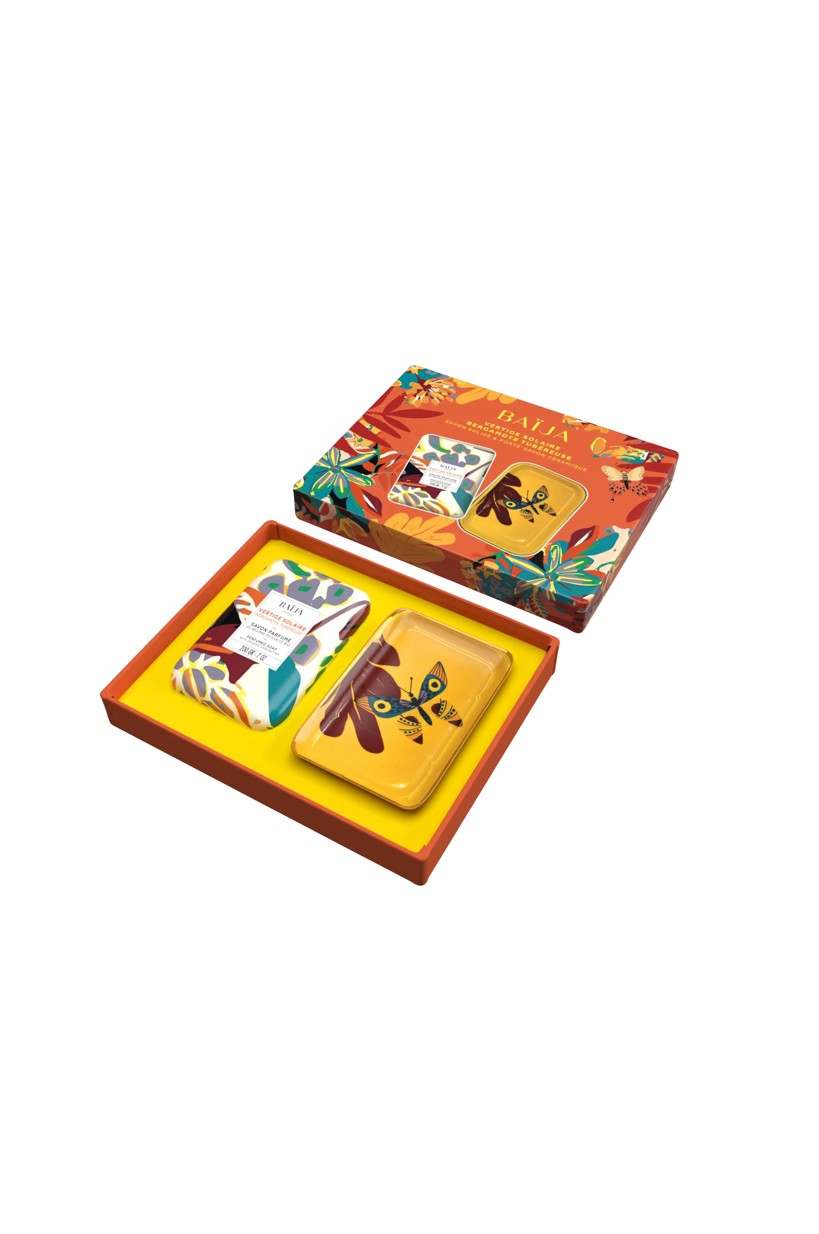 Oplev vores uadskillelige duo til hjemmet og kroppen. Ledsaget af sin dekorerede keramiske sæbeskål frigiver vores faste sæbe beriget med økologisk sheasmør en sensuel og forfriskende duft af bergamot og tuberose, en sand invitation til at give slip.