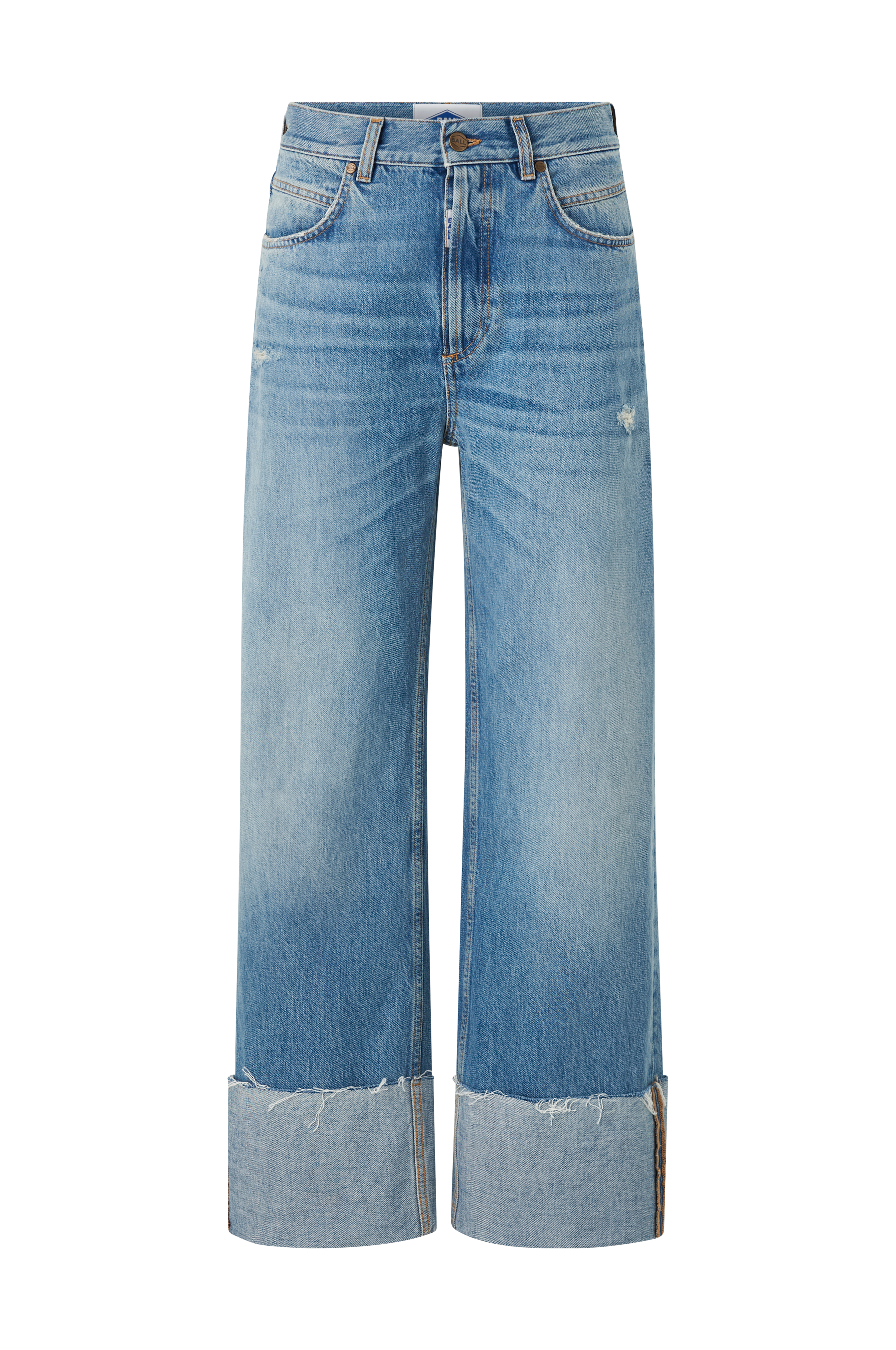 • Høj talje• To lommer foran• To baglommer• Gylp med lynlås• Syede benafslutninger med rå kanter
