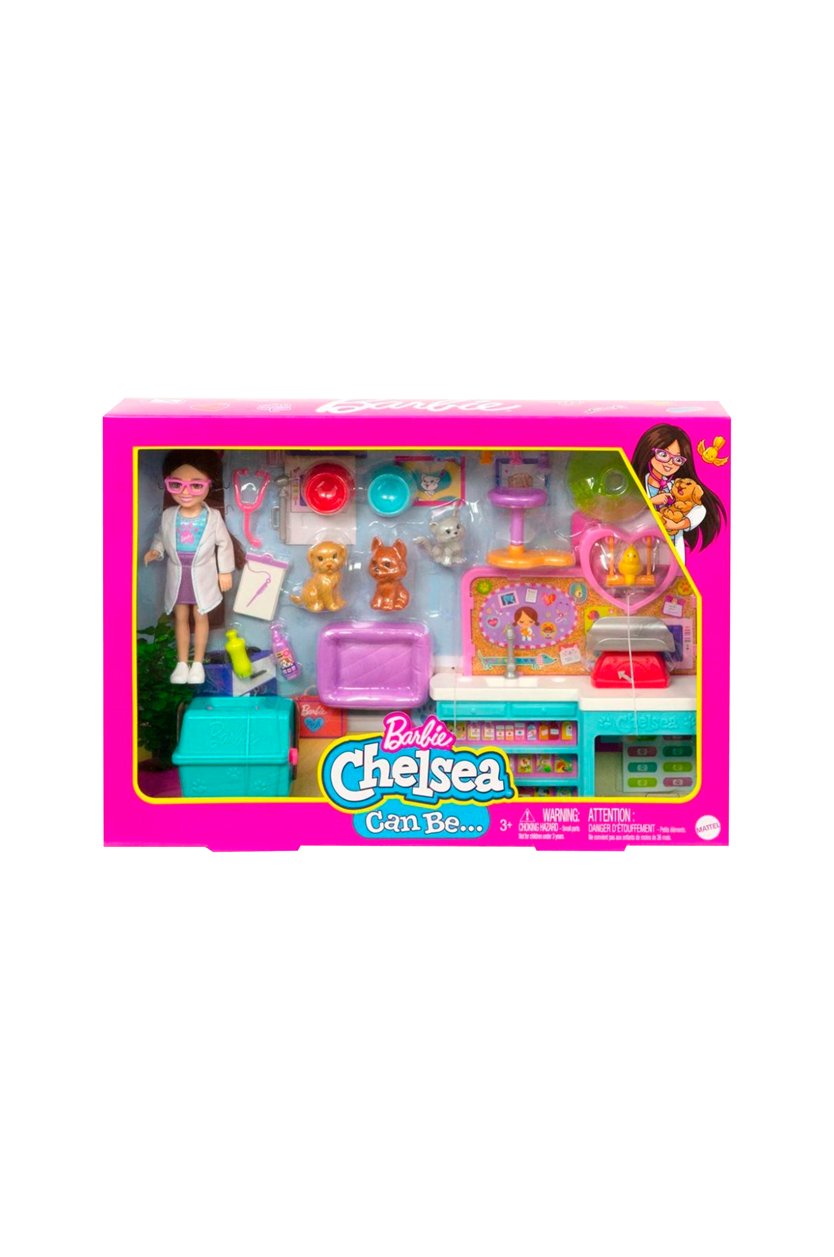 Chelsea-dukken® kan lege dyrlæge præcis som sin storesøster Barbie® med dette Barbie® Chelsea-dyrlægesæt®.