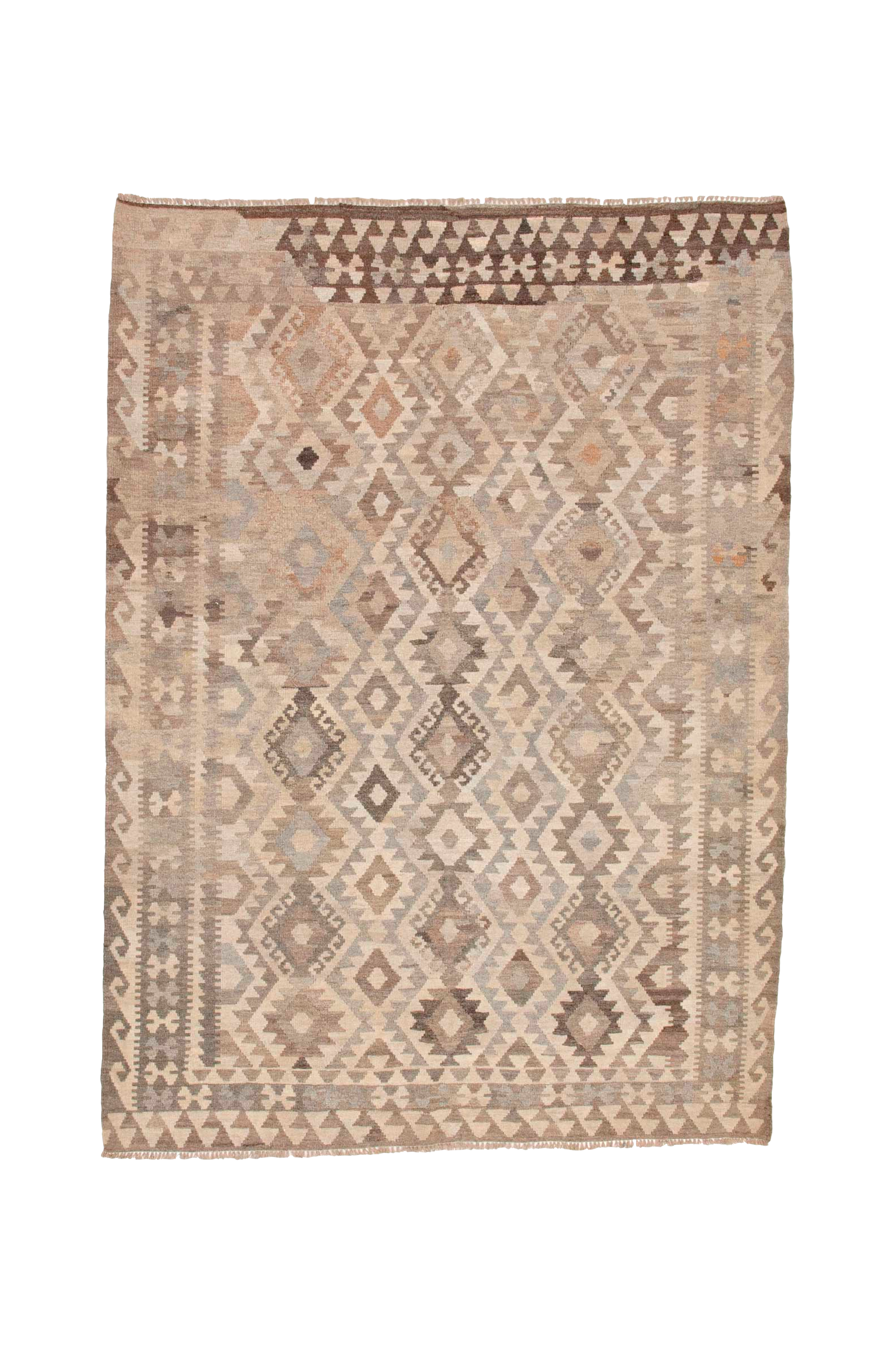 Et meleret tæppe i ufarvet garn af højeste kvalitet. Et traditionelt geometrisk mønster, hvor diamantformer pryder tæppet. Skønt varmende og smudsafvisende uld spreder hyggelig varme og giver tæppet lang levetid.