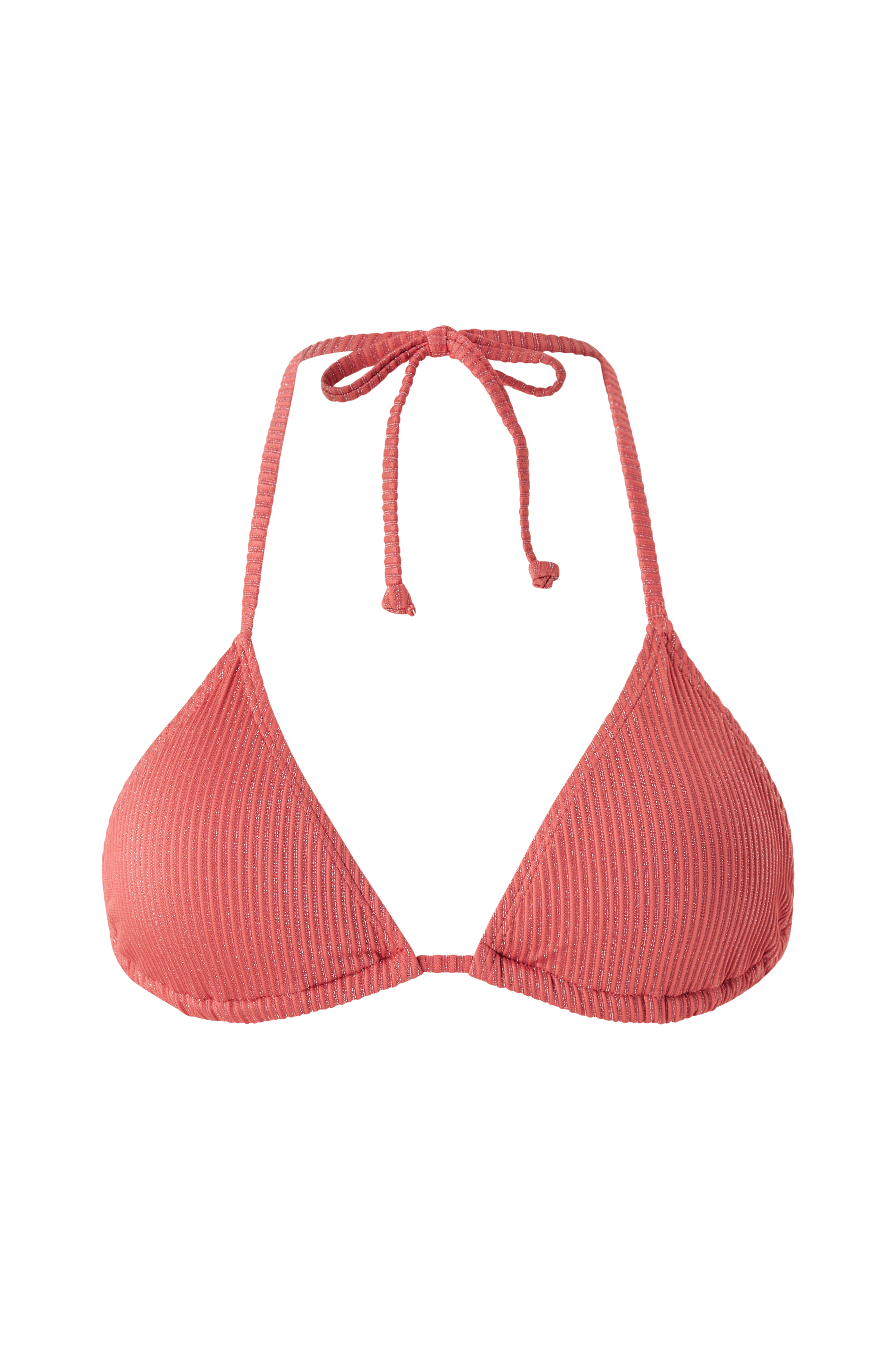 • Halterneckdesign• Ribbet, skinnende materiale• Aftagelig polstring• Bindebånd i nakken og i ryggen