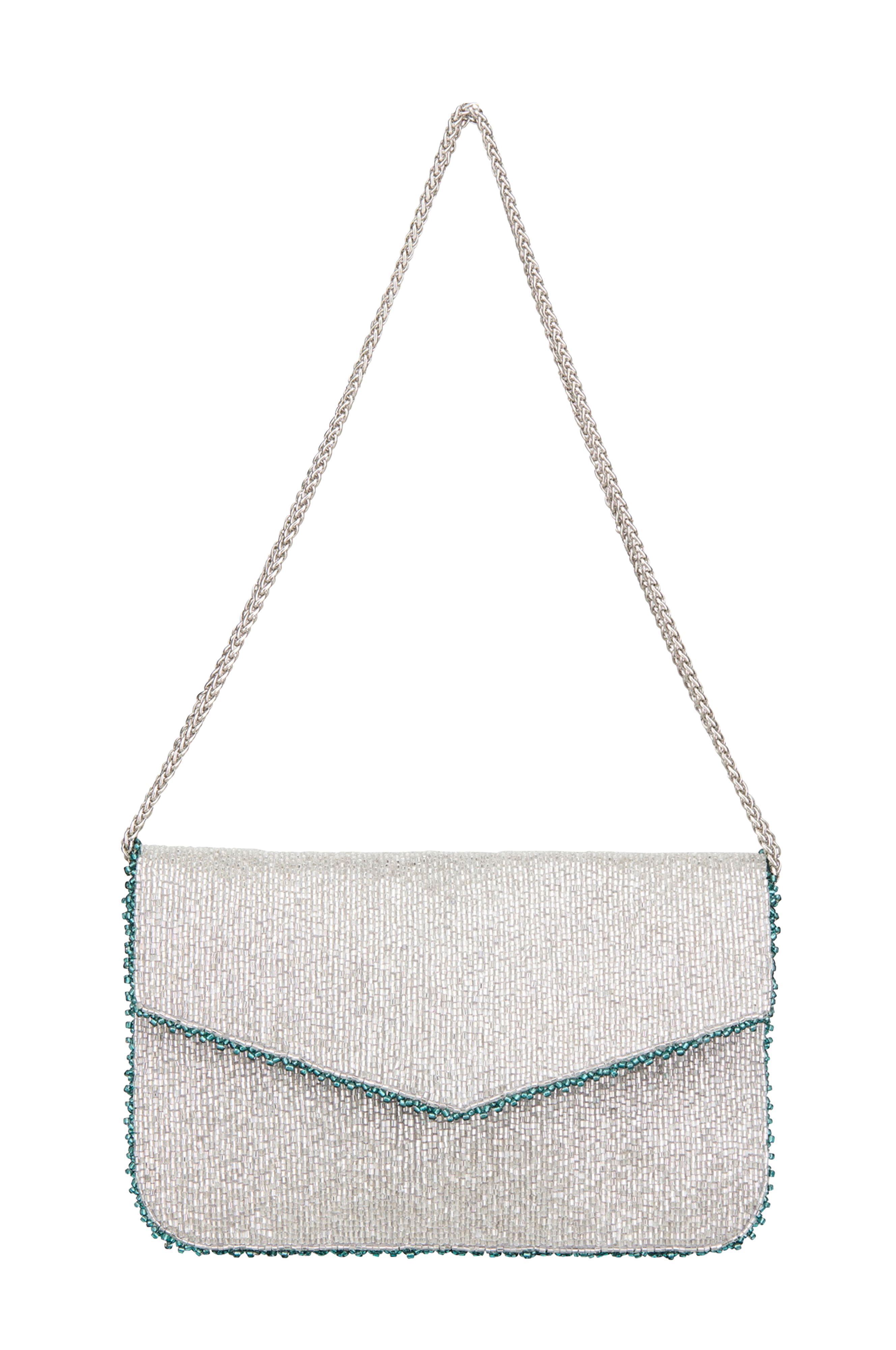 • Håndtaske klædt i små glitrende perler• Lang, sølvagtig kædeskulderrem• Skjult trykknap• Silkeagtigt stof på bagsiden og indeni• Lille lomme indeni• Bredde: 15 cm, længde: 25 cm