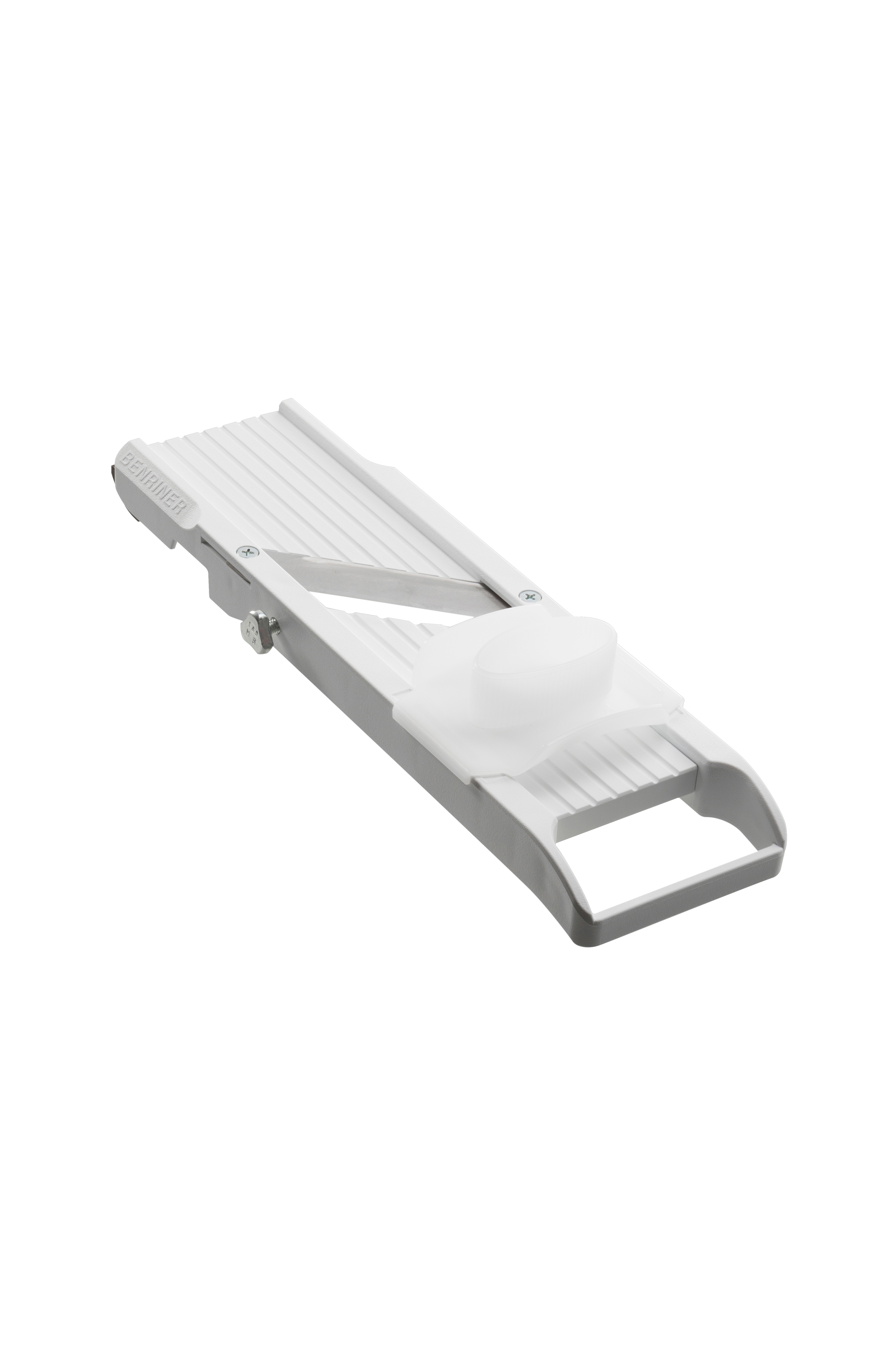 En førsteklasses mandolinjern, der skærer grøntsager og rodfrugter i tynde skiver eller strimler. Den lige klinge er håndslebet og har en trinløs indstilling, fra 0,5 til 7 mm. Mandolinjernet kommer med tre udskiftelige klinger til makulering og julienne og en praktisk fingerbeskytter. I bunden er der en skridsikring, der letter brugen. Mål: 32x10x4 cm.