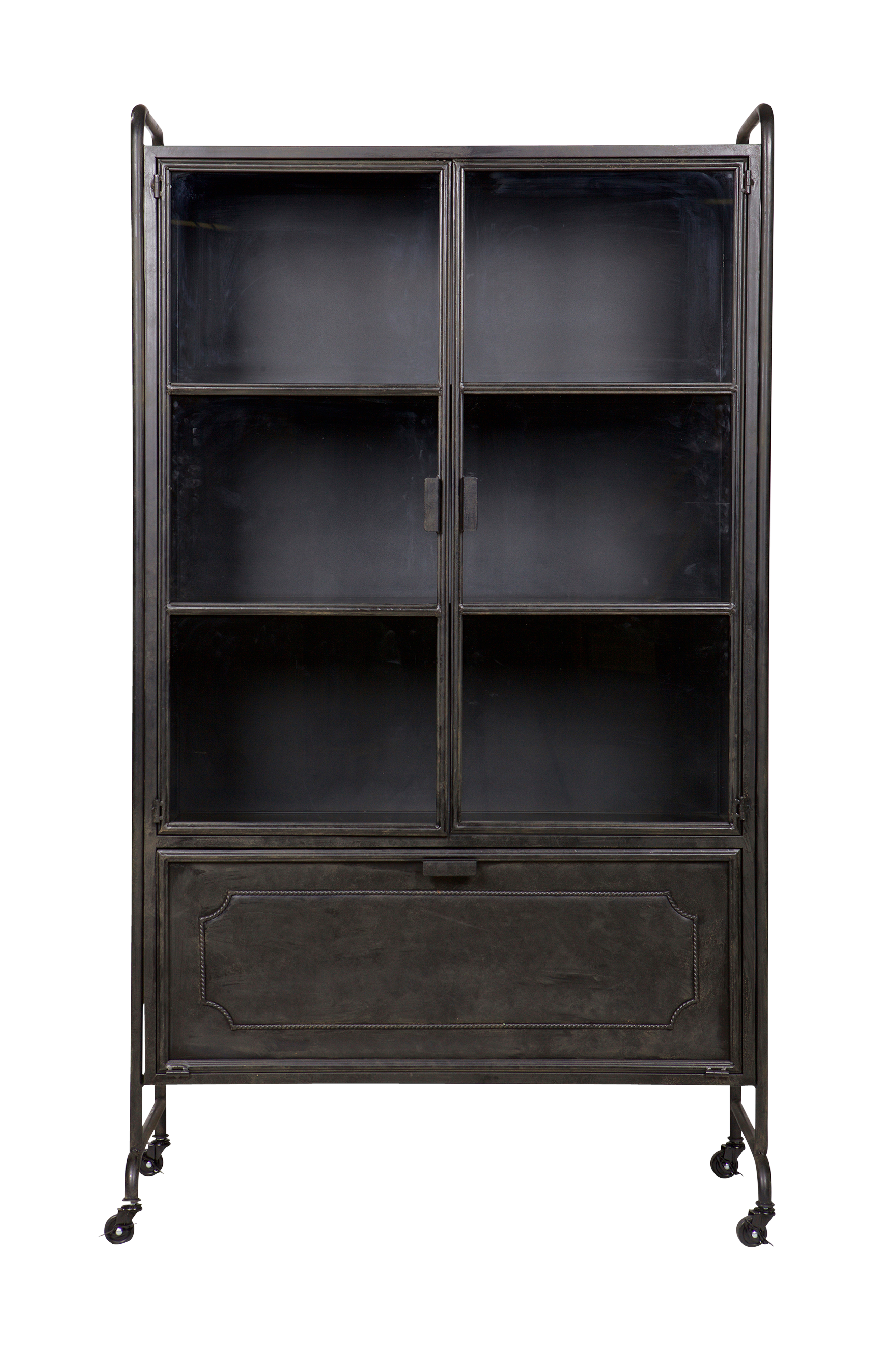 Dette skab er fremstillet i metal og står på hjul. Bag de to glaslåger er der tre rummelige hylder, og nedenfor er der et praktisk opbevaringsrum.