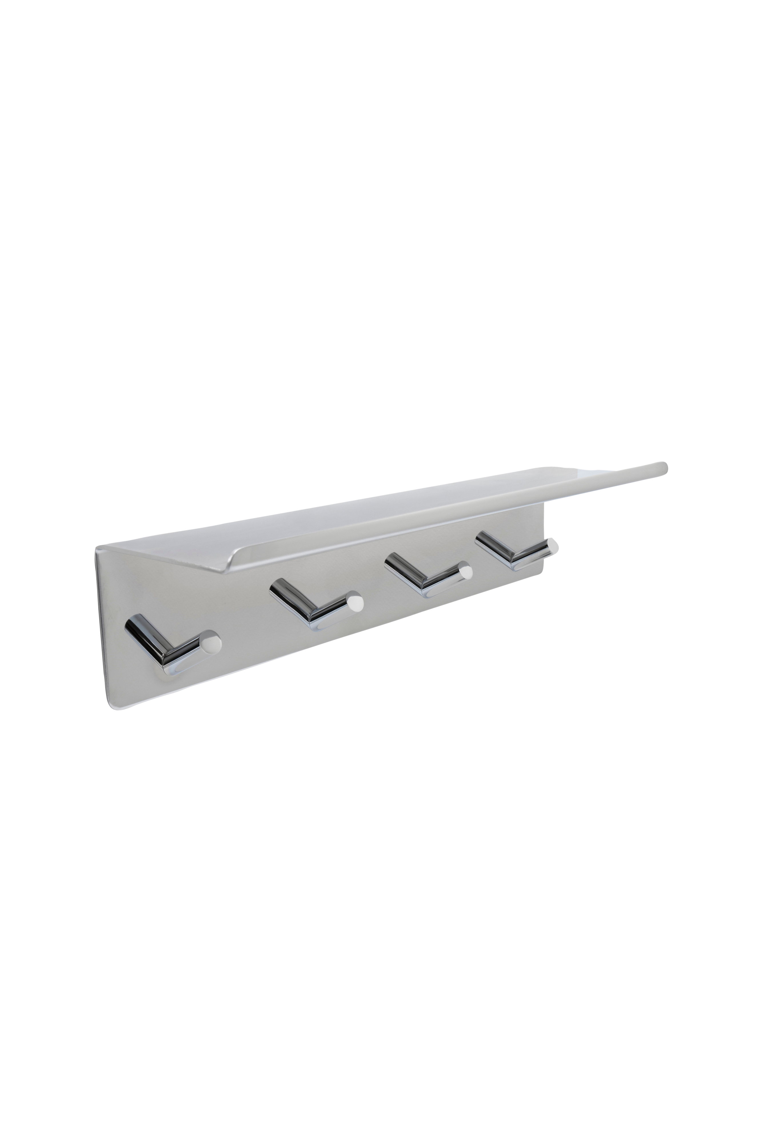 Base - Krogskinne med hylde er den perfekte løsning til at opfylde nutidens badeværelsesbehov og samtidig tilbyde et slankt design. Fremstillet af solidt rustfrit stål. Vi har kombineret fire funktionelle kroge til elegant ophængning med en praktisk hylde, der giver dig mulighed for at opbevare smykker, dekorere med en smuk vase eller tænde et duftlys for at skabe den rette atmosfære. Kombinationen af kroge og hylde gør Beslag Designs knagerække til en pladsbesparende og alsidig løsning til badeværelset. Med sit minimalistiske og moderne design passer den perfekt ind i forskellige badeværelsesstile og skaber en harmonisk orden. Kroghylden har en selvklæbende bagside, der gør det nemt at installere den uden at skulle lave unødvendige huller.