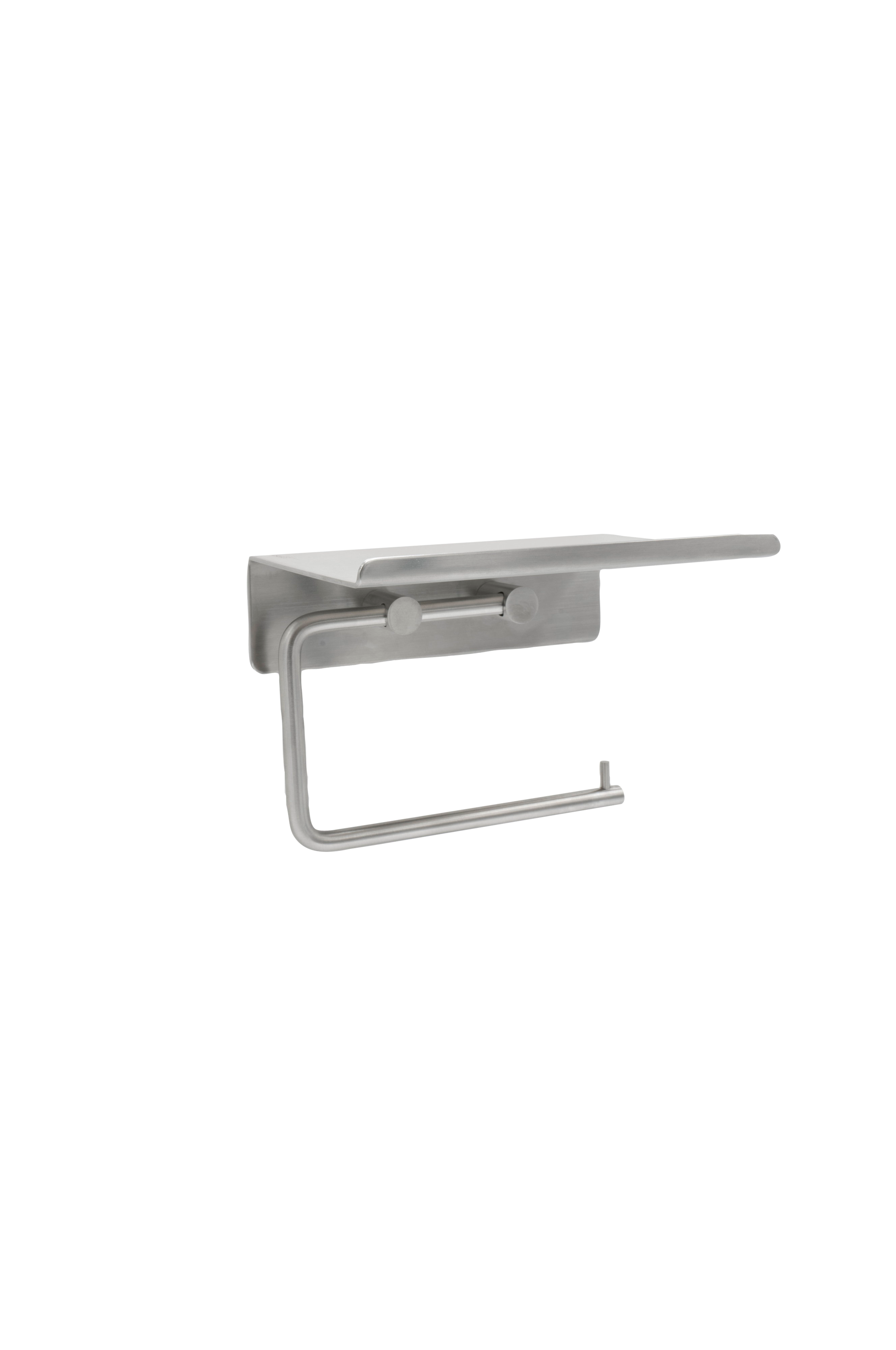 Base toiletpapirholder med hylde er en moderne løsning, der opfylder nutidens badeværelsesbehov med en følelse af elegant design. Fremstillet af massivt rustfrit stål. Den kombinerer to praktiske funktioner i én, og den smarte hylde giver dig mulighed for at dekorere med duftpinde, duftlys eller et sted at opbevare din mobiltelefon. Med sit tidløse og slanke design passer den problemfrit ind i forskellige badeværelsesindretninger. Det er nemt at installere takket være den selvklæbende bagside, så du ikke behøver at bore i væggen.