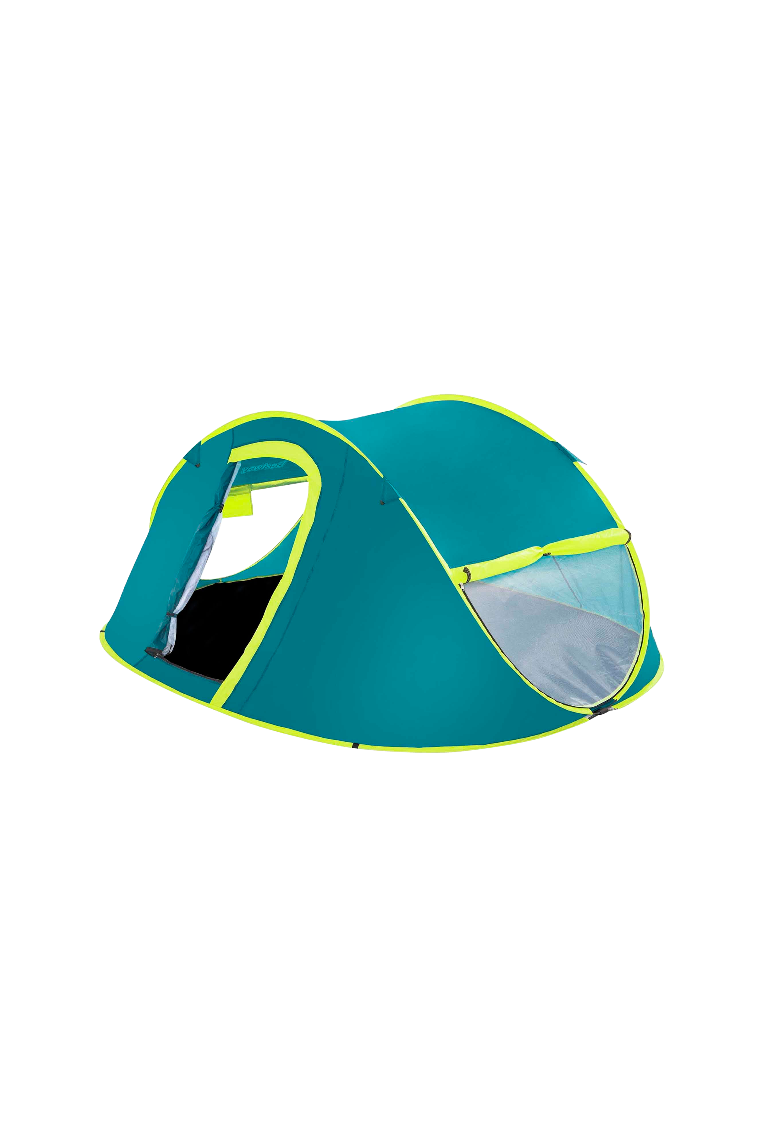 • Pop-up-teltdesign til hurtig opsætning. • Passer til to personer. • Blågrønt og gult farveskema. • Har et netvindue til ventilation. • Let og bærbart.
