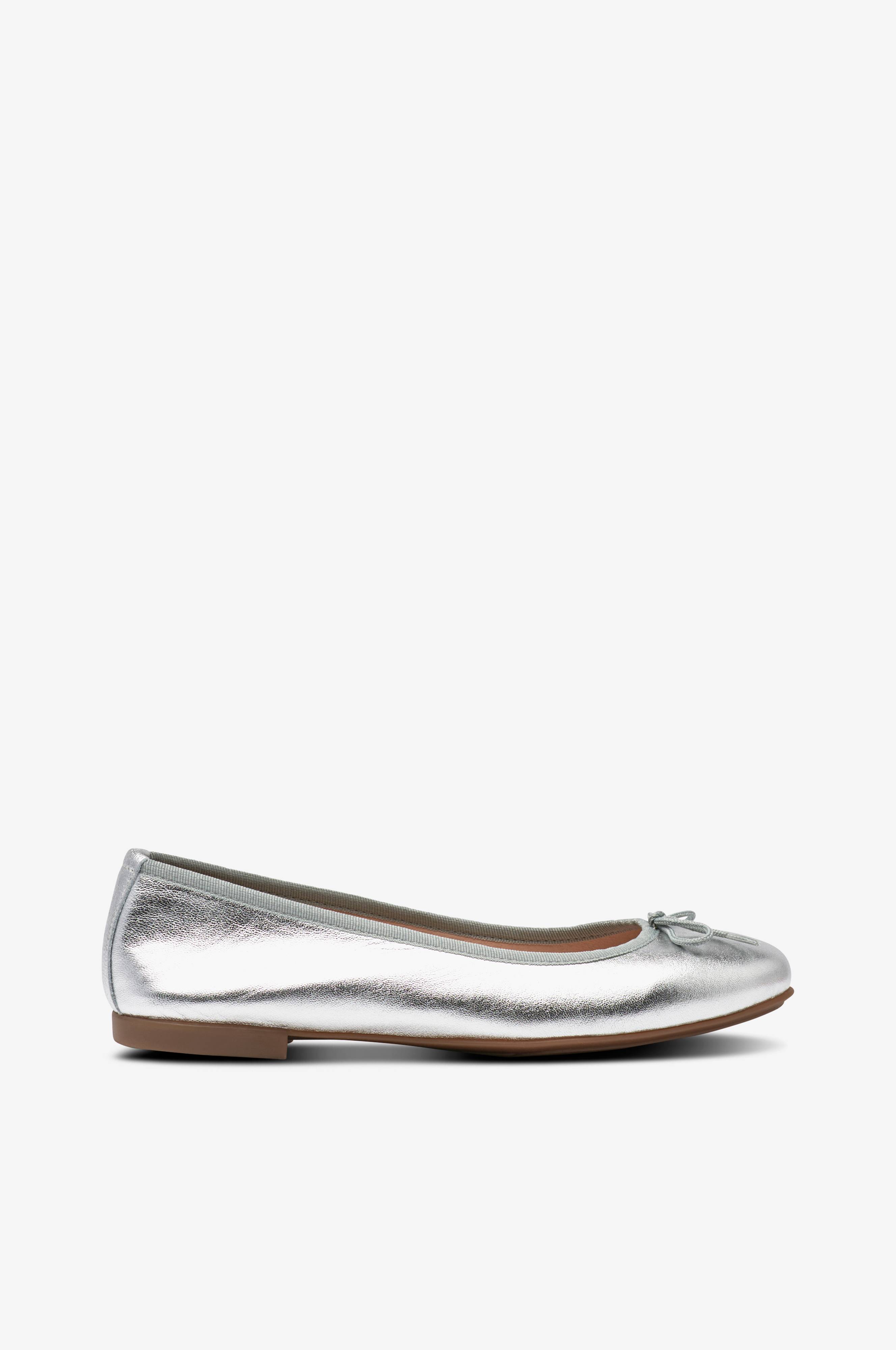 • Sølvagtige ballerinasko i læder• Bånd foran• Kant i tekstil hele vejen rundt