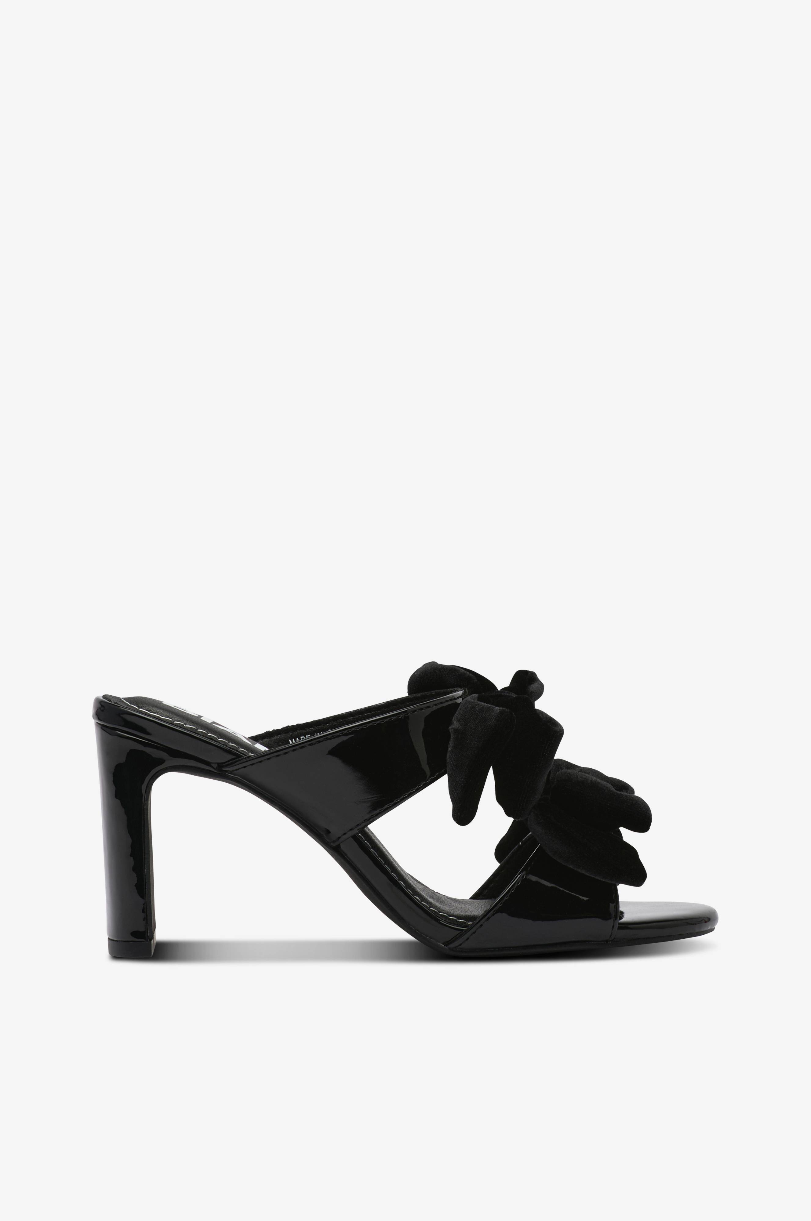 • Højhælet sko med remme i patent imiteret læder• Store sløjfer i velour• Hælhøjde: 8 cm