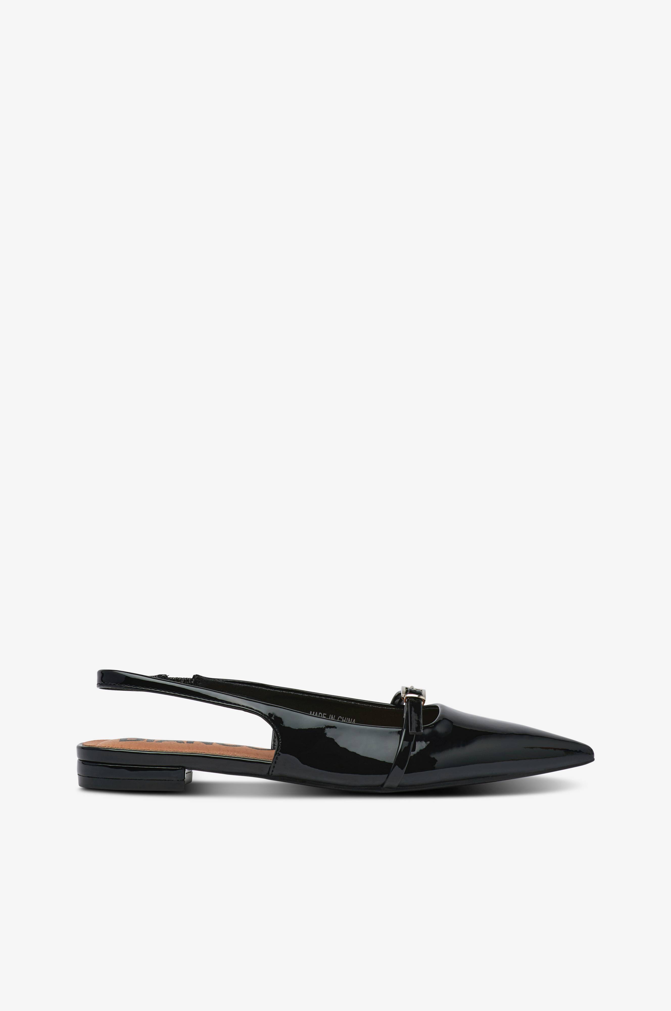 • Model i imiteret læder• Spids snude• Smal, justérbar rem over foden• Hælrem med elastisk Vedhæftning• Blød polstret indersål• Lav, beklædt hæl