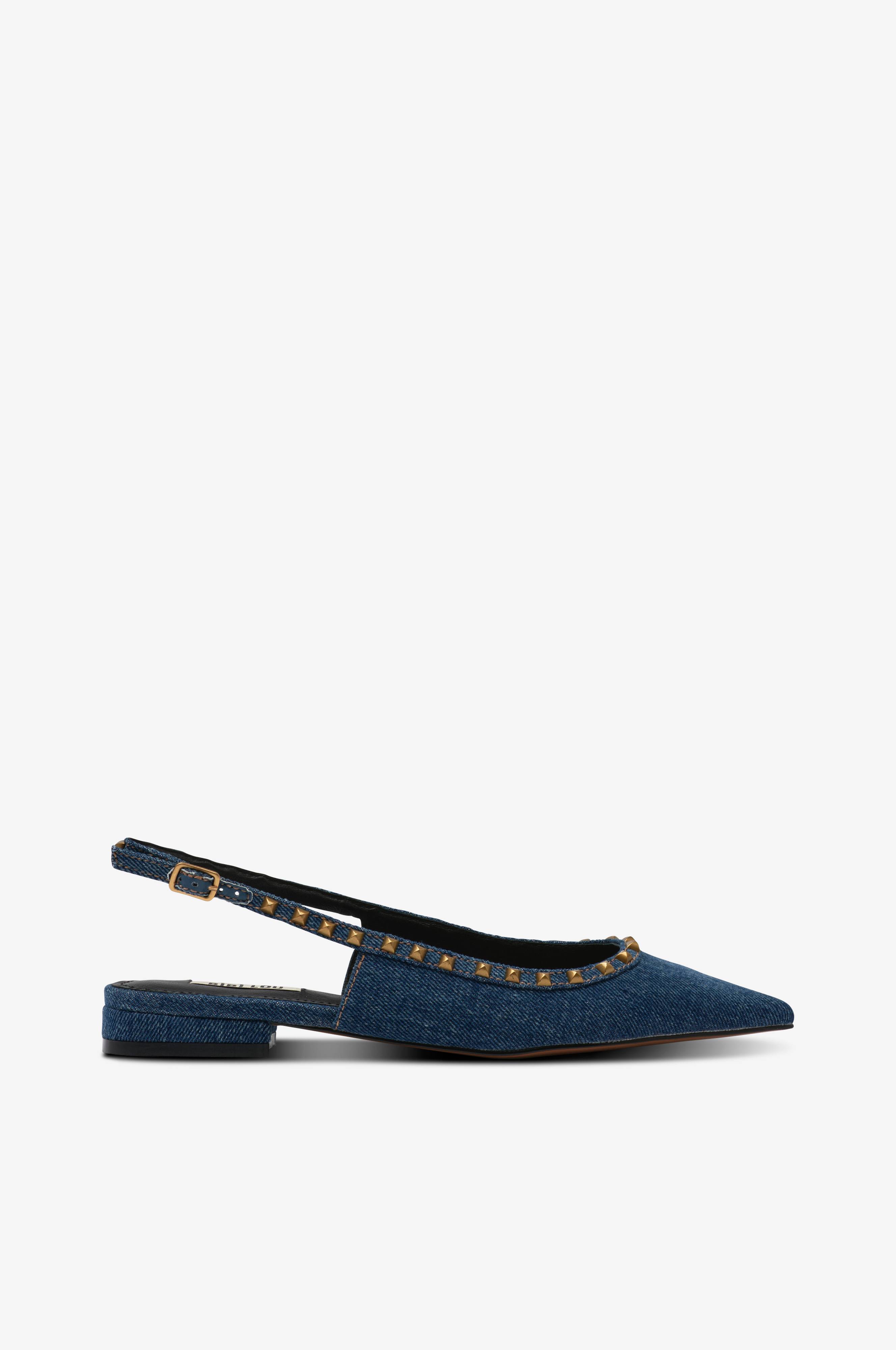 • Model med spids snude• Slingback med justérbar hælrem• Guldfarvede nitter hele vejen rundt• Lav, beklædt hæl