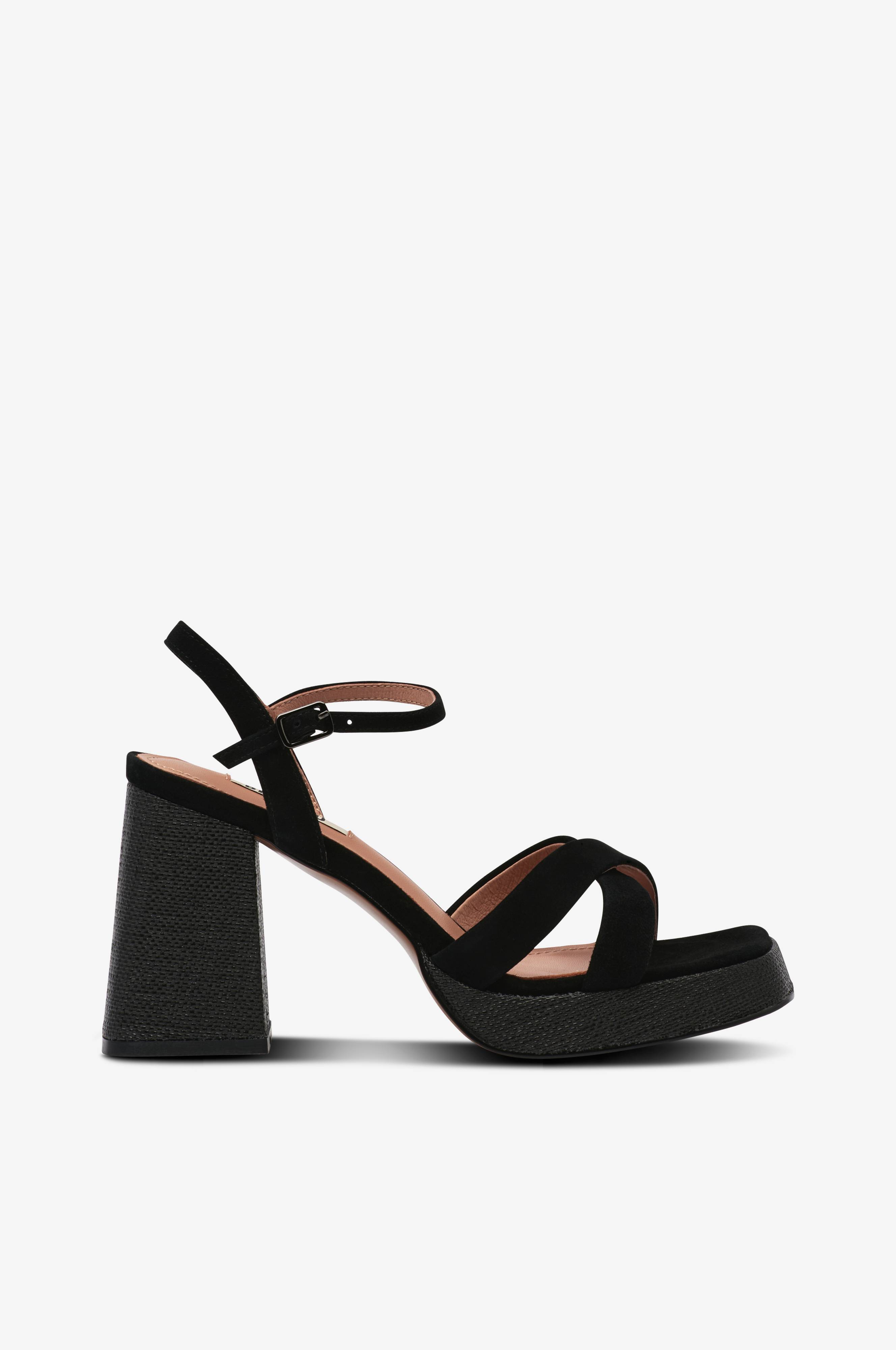 • Krydsende remme i ruskind• Spænde ved anklen• Struktureret hæl og plateausål• Hælhøjde: 9 cm• Sålhøjde: 2 cm