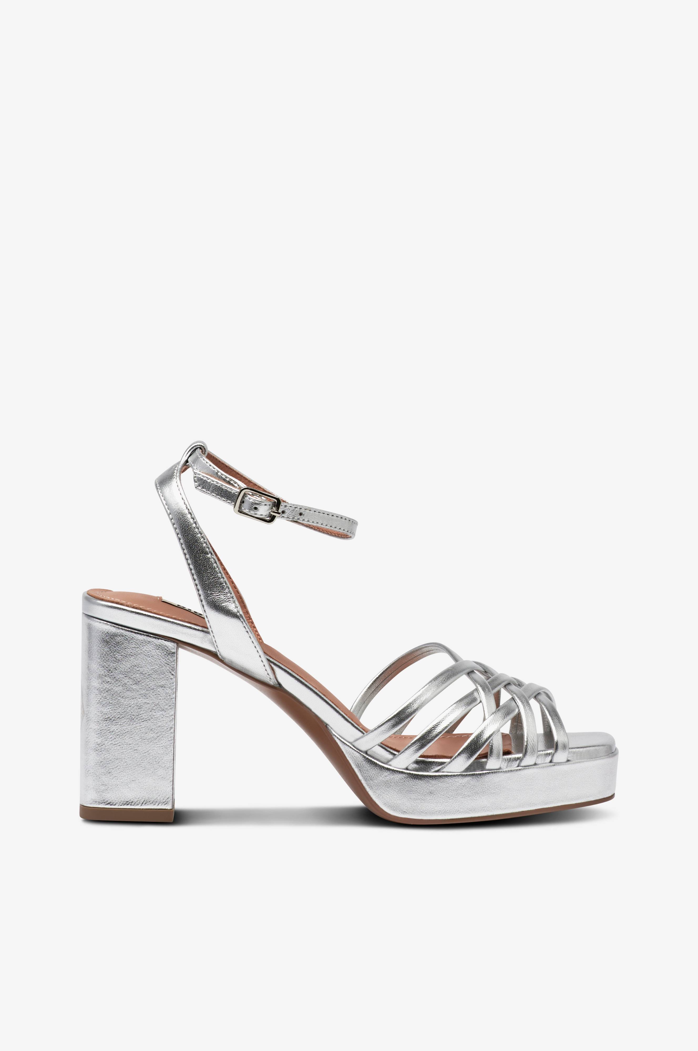 • Tynde, sølvfarvede remme i læder• Justérbar rem ved anklen• Platformsål• Høj blokhæl• Hælhøjde: 9 cm• Sålhøjde: 2 cm