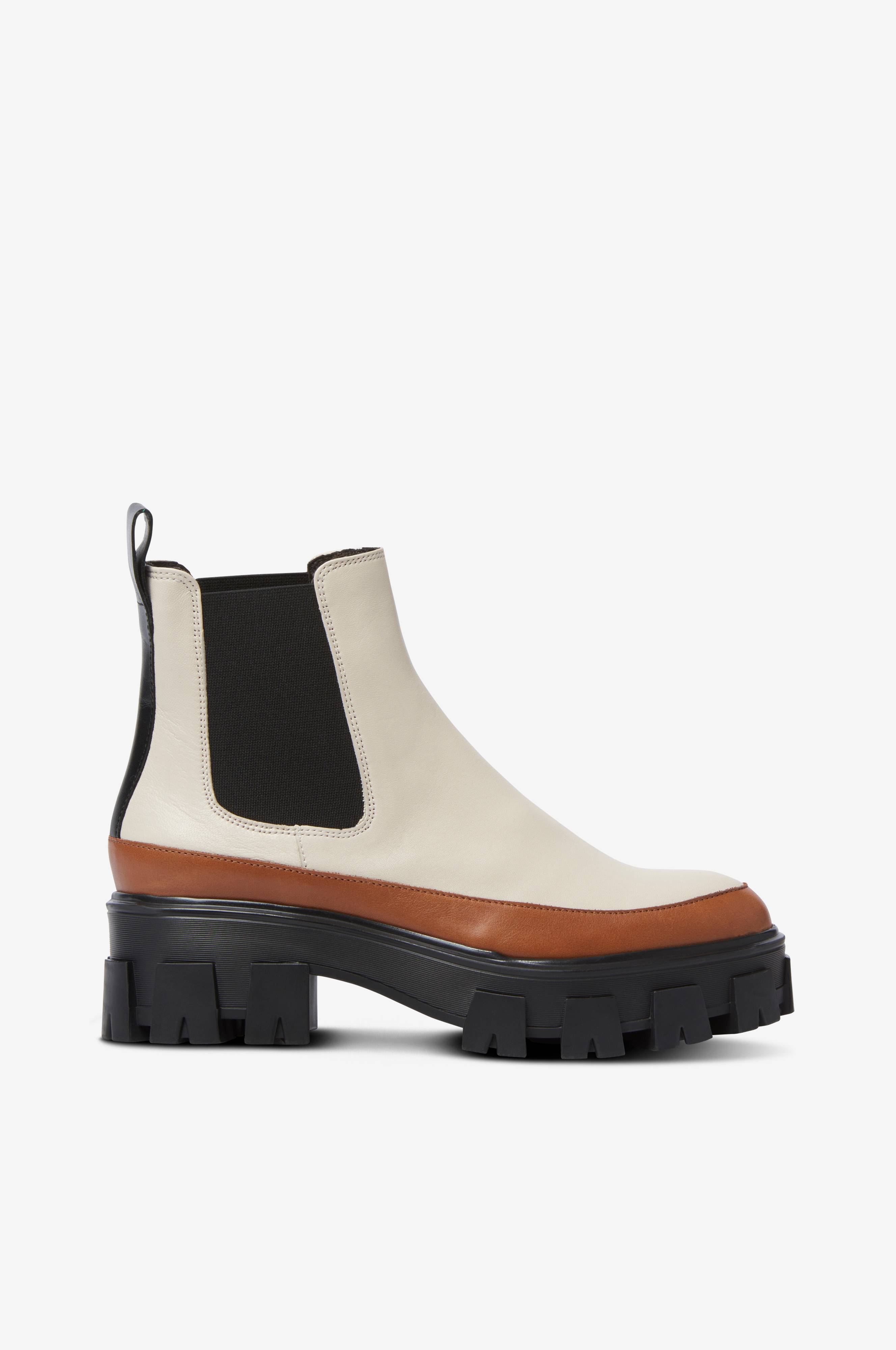 Boots med en grov silhuet. I fint skind med kontrastfarvet kant langs sålekanten. Brede elastikpaneler på begge sider af skaftet. Kraftig, noget høj sål med hæl og groft sålmønster. Skafthøjde ca. 13 cm, hælhøjde ca. 5,5 cm.