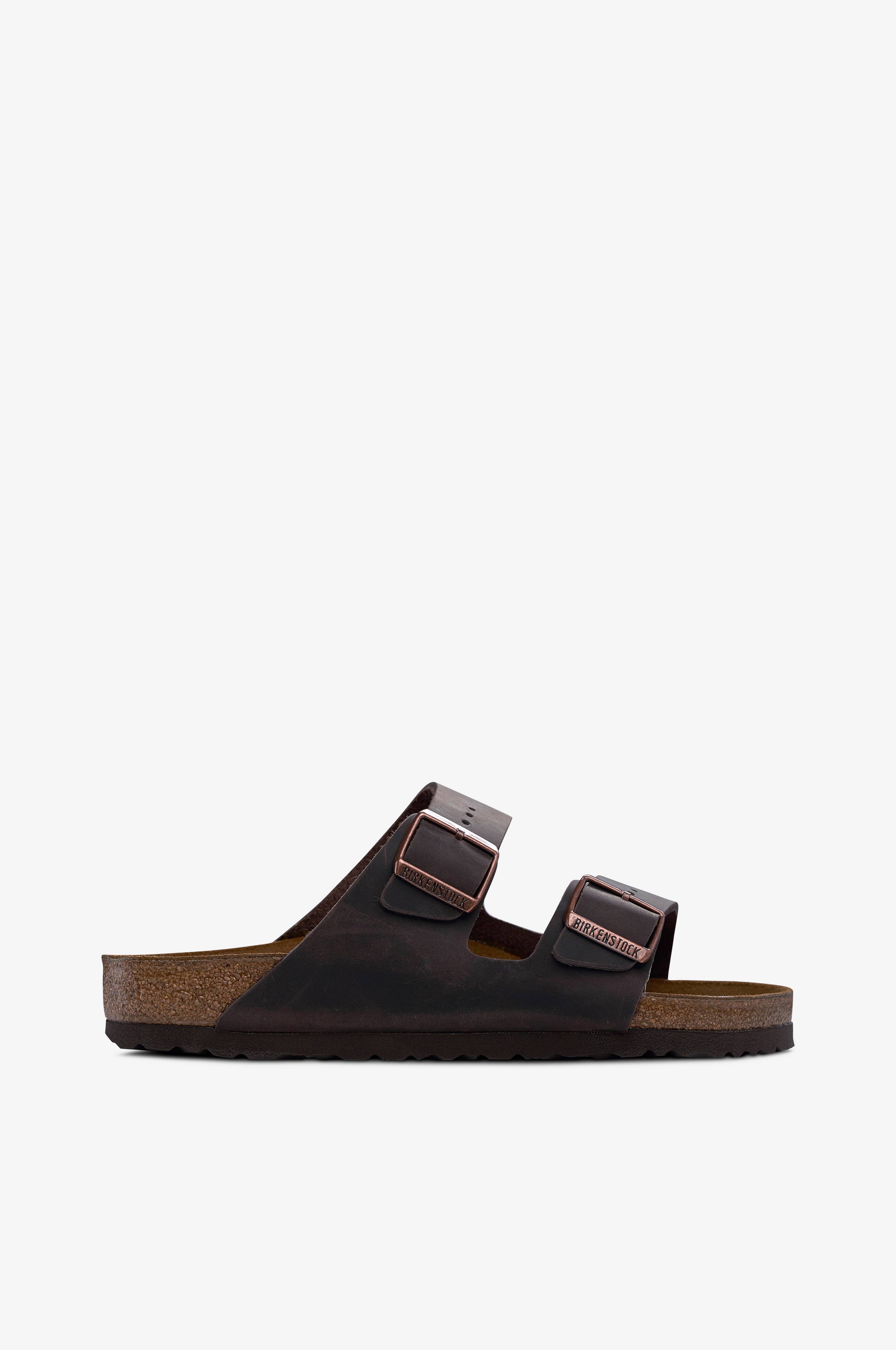 Behagelige sandaler i olieret læder. To remme over vristen justeres med kobberfarvede metalspænder. Klassisk fodseng. Normal pasform.