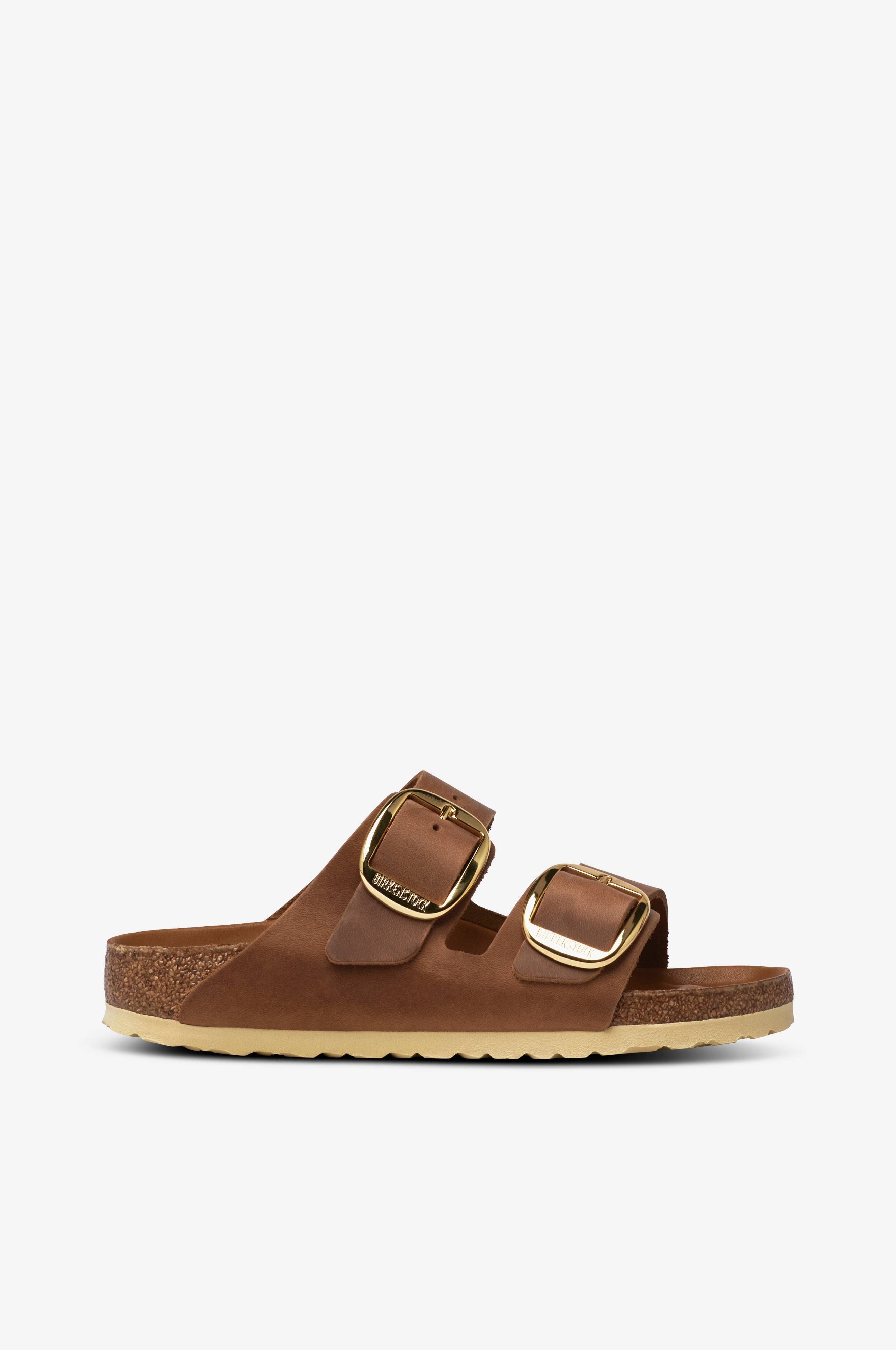 Klassiske Birkenstock-sandaler i læder med ekstra store guldspænder. Anatomisk formet, klassisk fodseng i læder. Mellemsål af kork og ydersål af EVA.