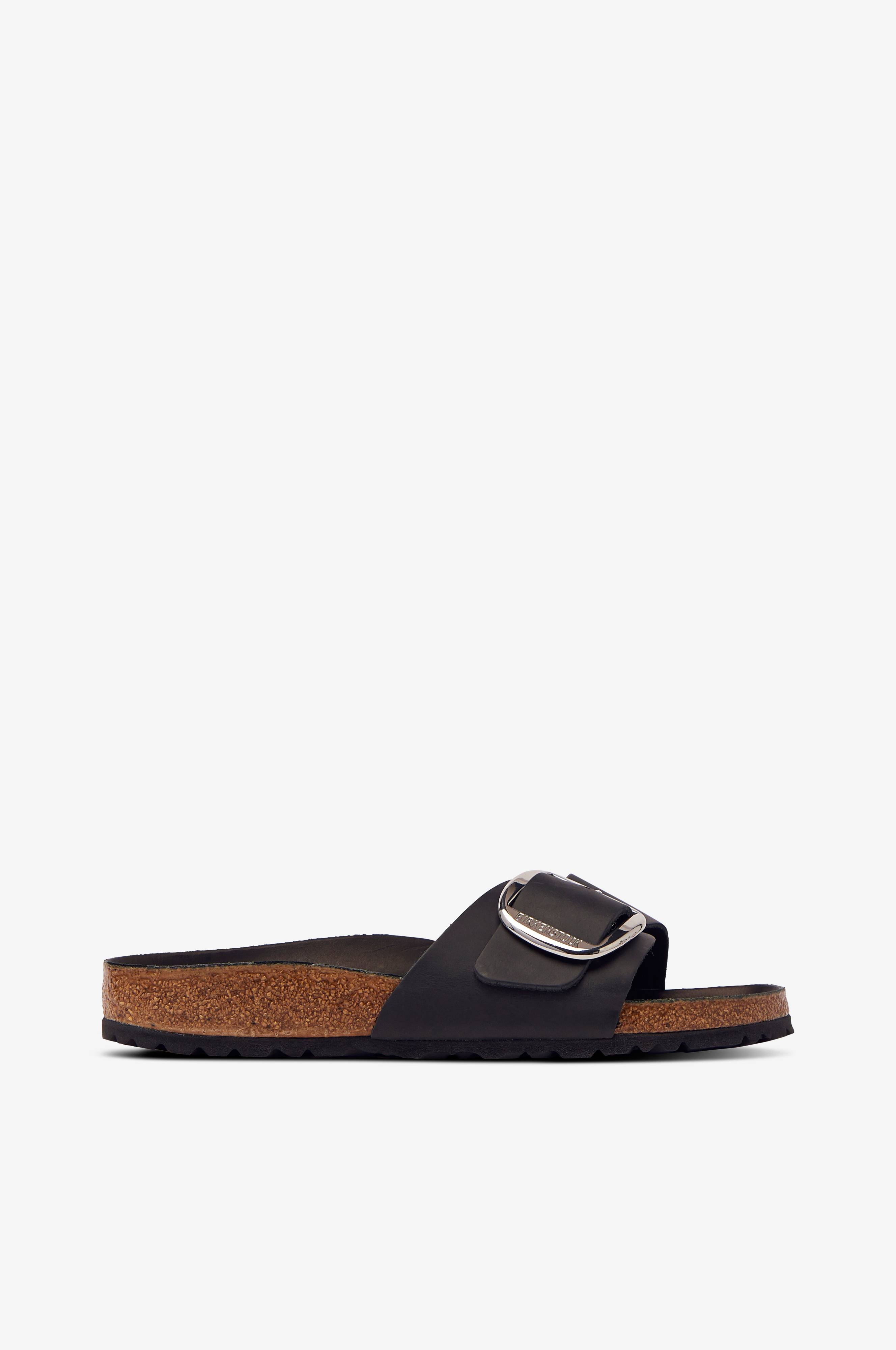 Sandaler Madrid Big Buckle fra Birkenstock med anatomisk fodseng i kork og vokset læder. Bred rem i skind med stort sølvfarvet spænde over foden.