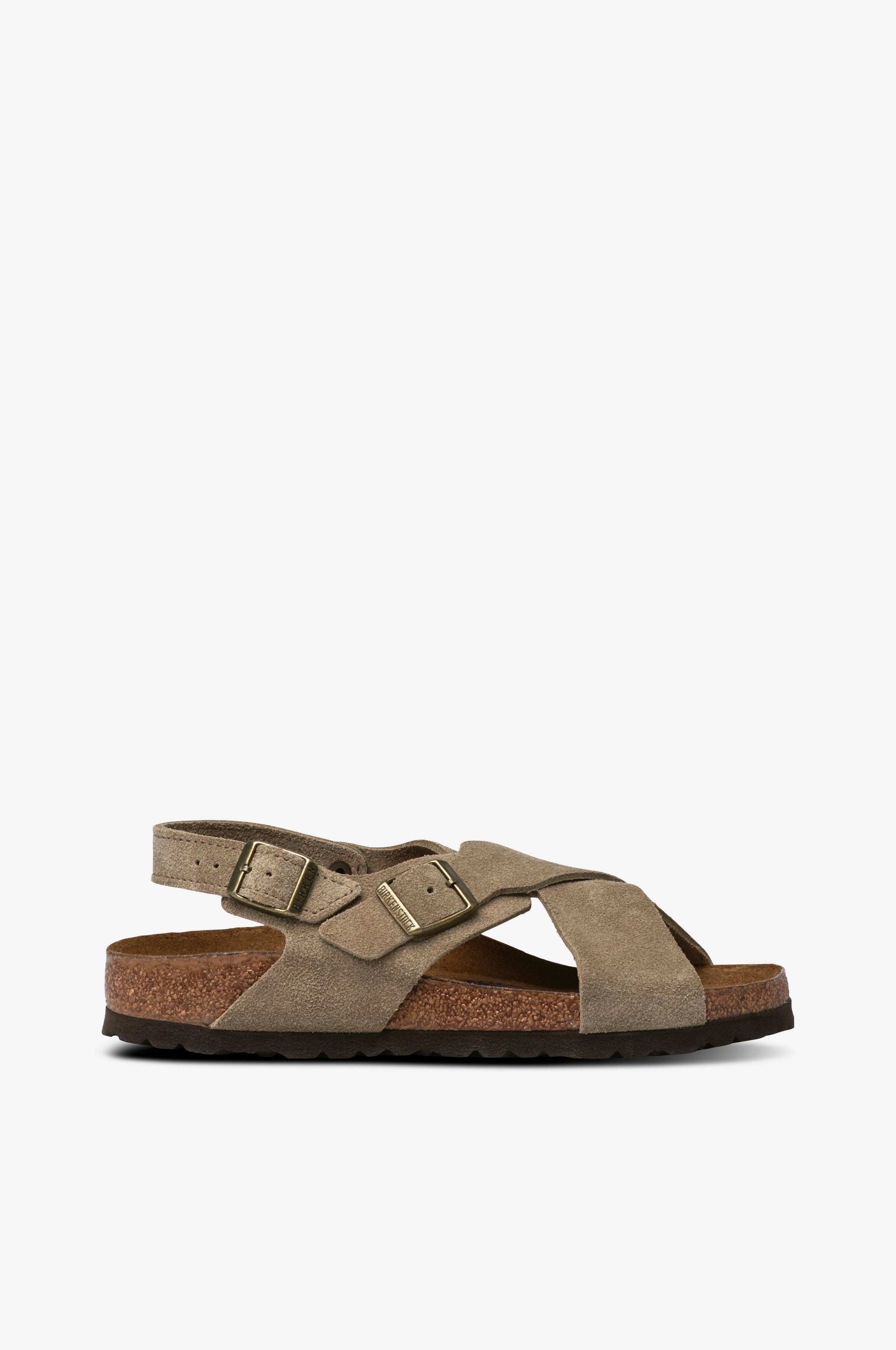 Birkenstock-sandal i ruskind med en sporty silhuet med brede, krydsede remme og to spænder. Anatomisk fodseng med skumindlæg der giver skøn dæmpning. Ydersål i EVA.