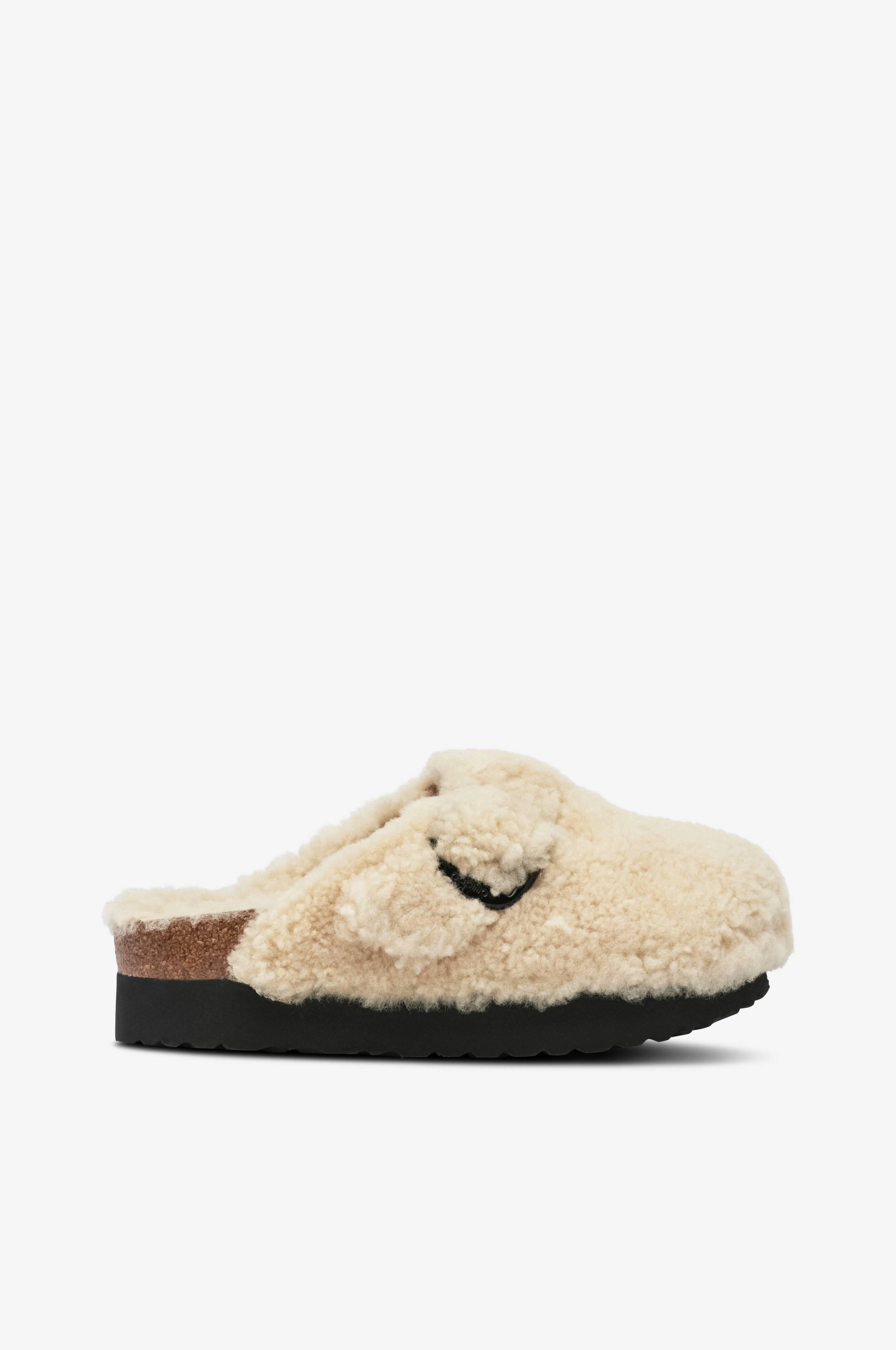 • Tøfler i fåreuld• Justérbar rem over foden• For i fåreuld• Anatomisk fodseng i kork• EVA ydersål