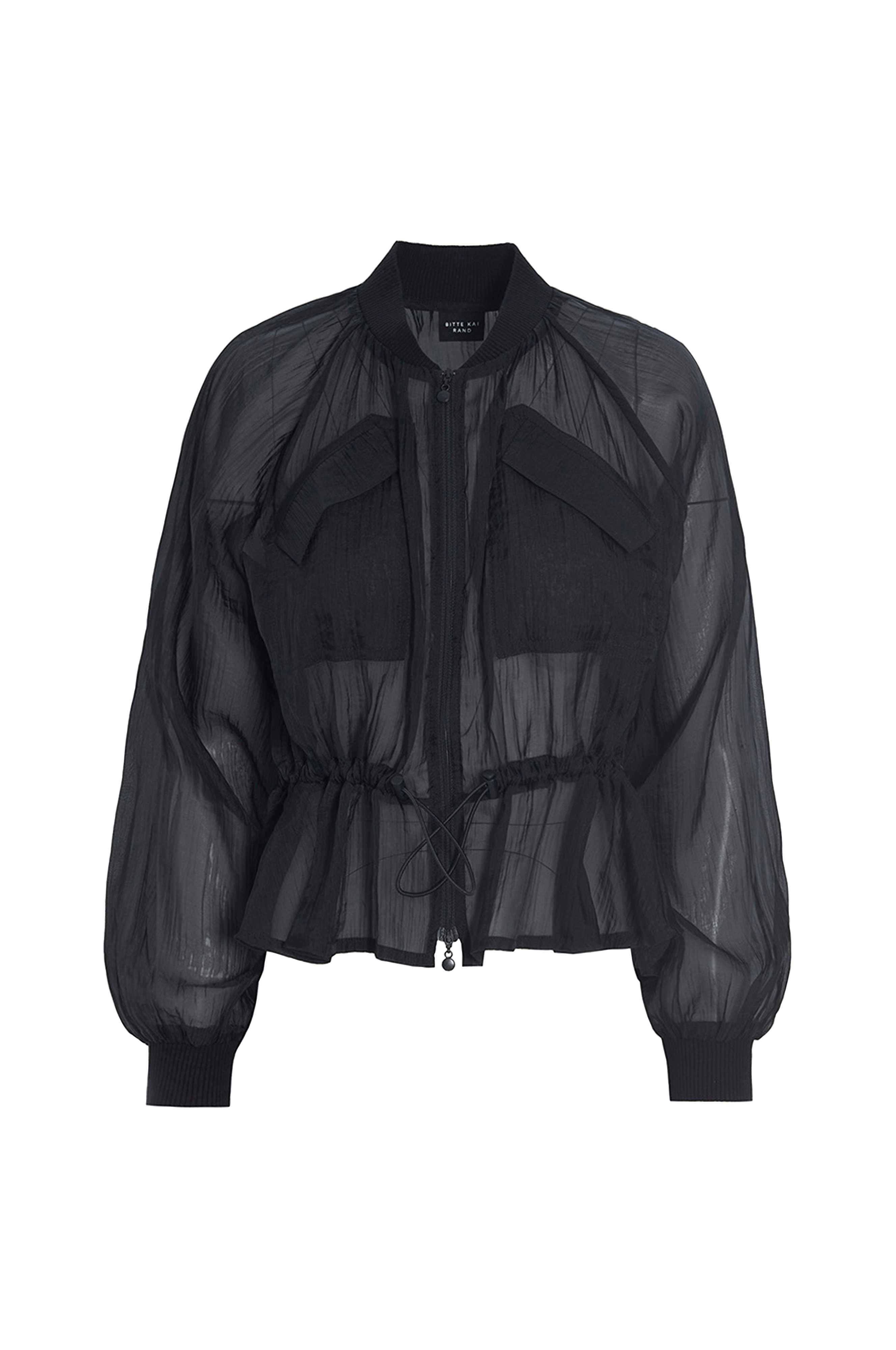 • Model i chiffon med to-vejs lynlås• Ribstrikket krave• Brystlommer med låg• Elastisk træksnørre med stoppere ved taljen• Raglanærme med ribmanchet ved manchetterne