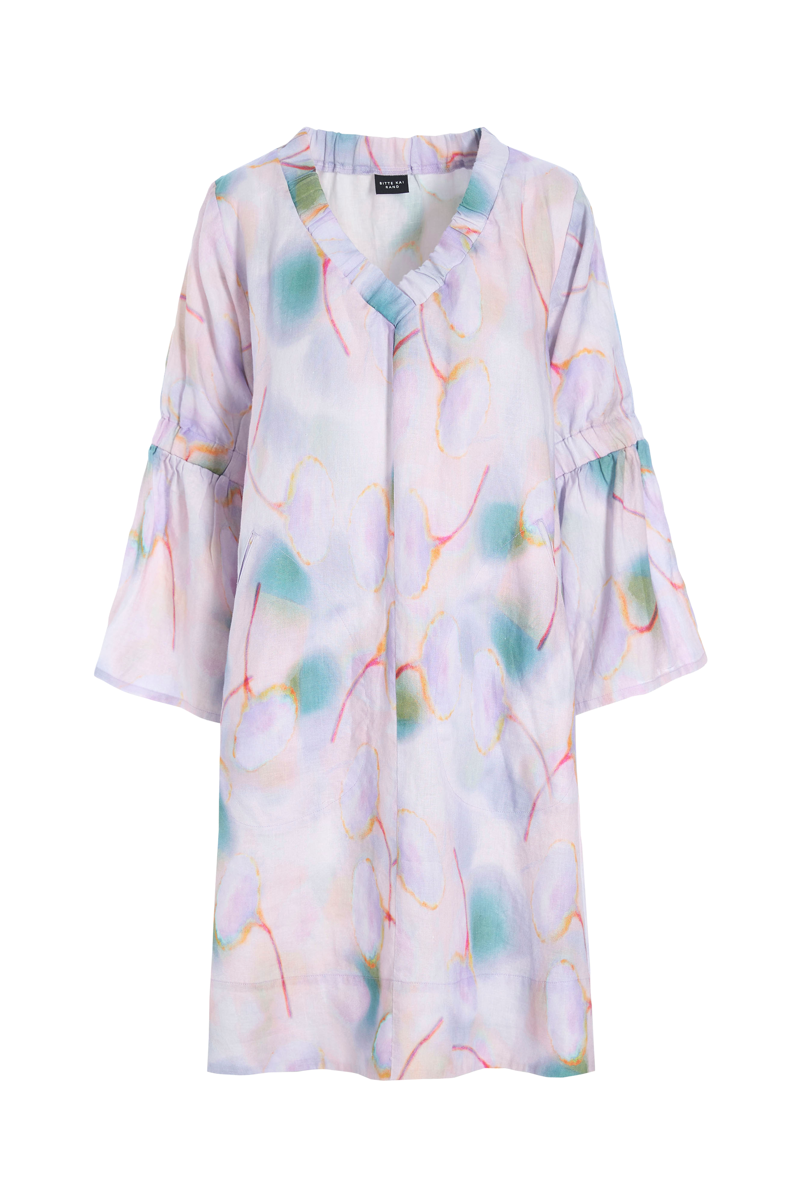 • Kjole i hør med et kunstnerisk tryk• A-linje design• Ærmer med svaj med vidde• Elastisk v-udskæring• Længde: 95 cm i størrelse S