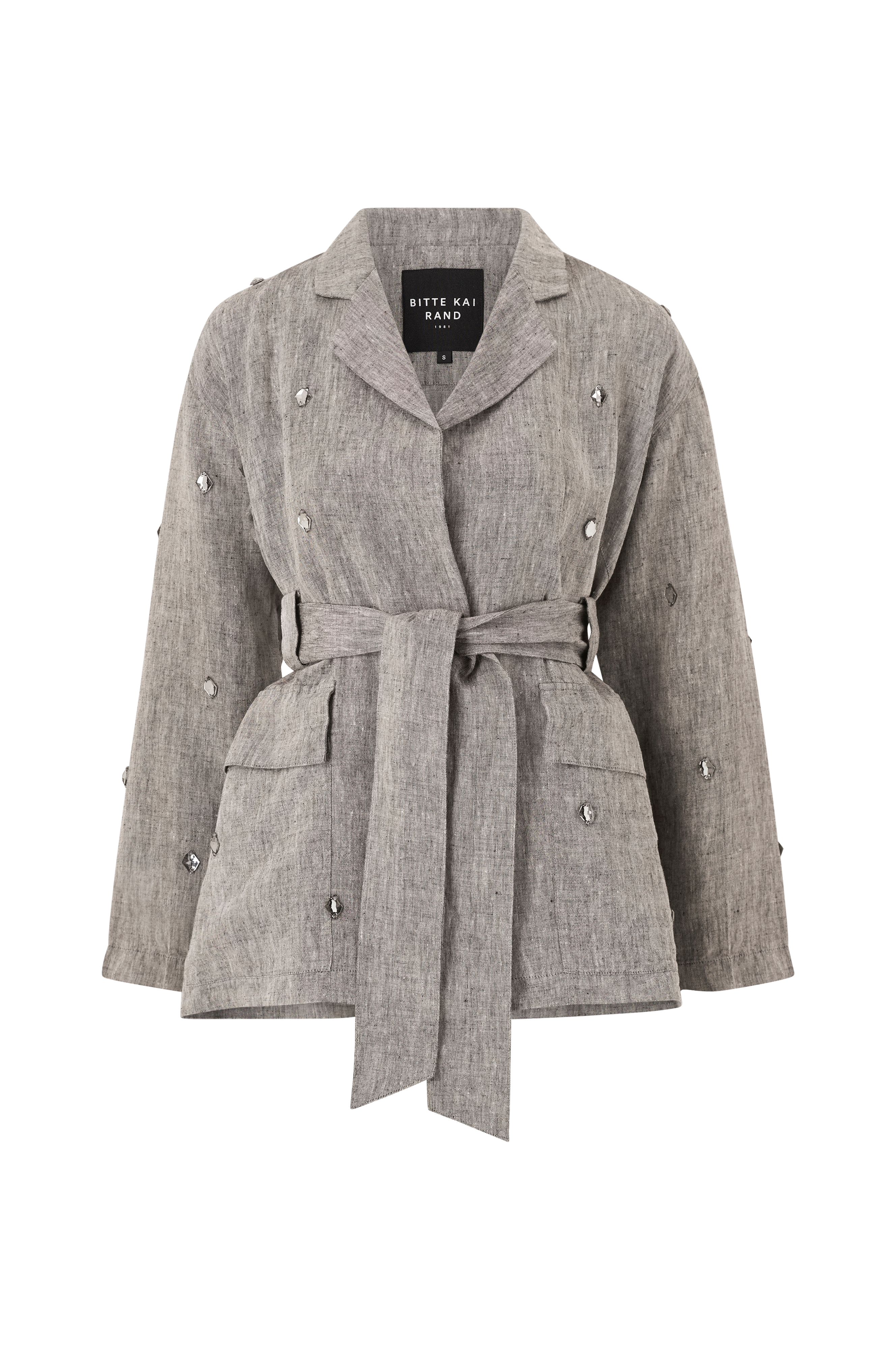• Overpaningsmodel med stropper og bindebælte ved taljen• Store, broderede rhinstene overalt• Krave med revers• Store lommer med låg• Uforet• Længde: 70 cm i størrelse S