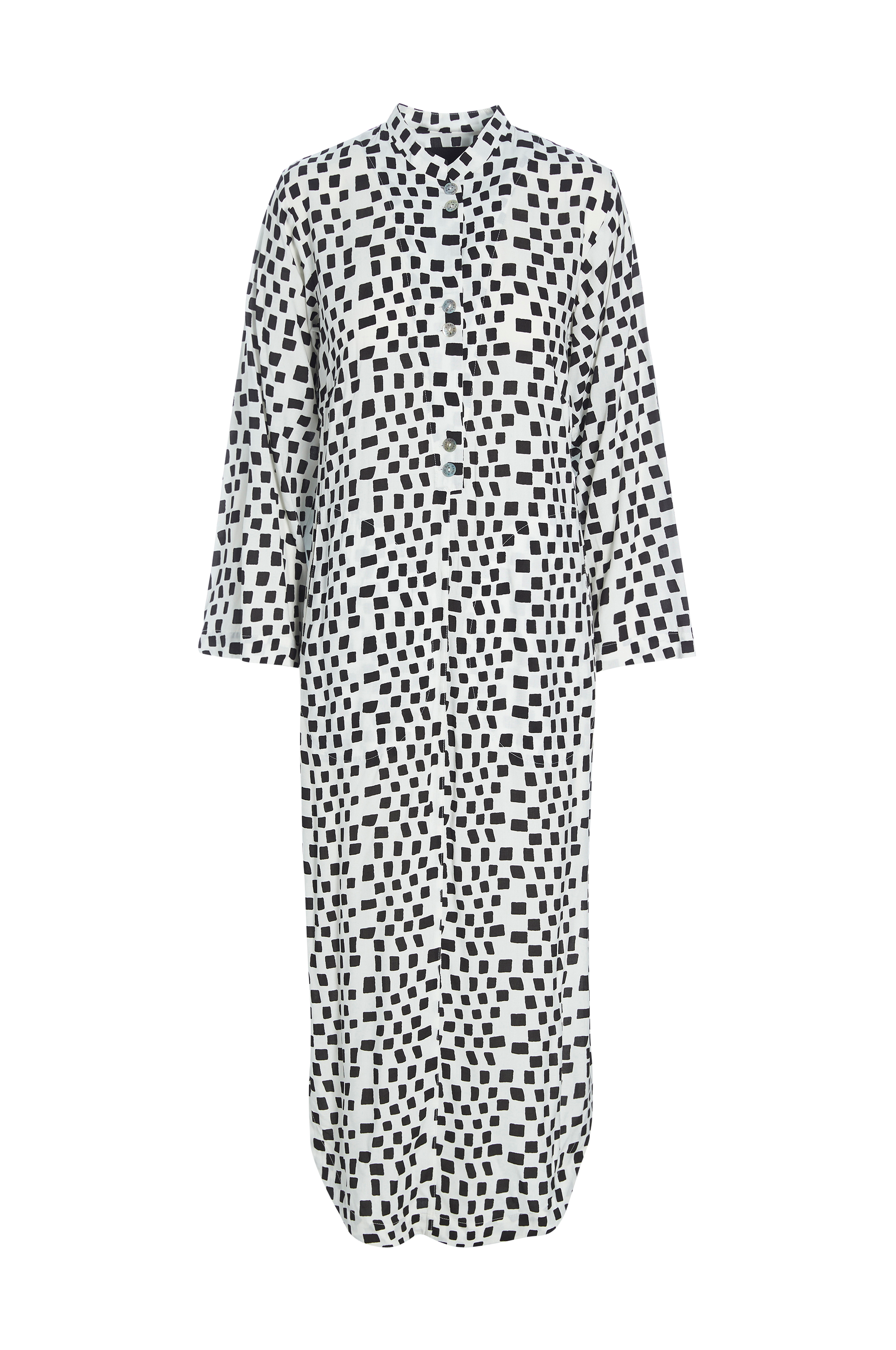 Lang kjole med mønster og skjortelignende snit som giver en fin silhuet.