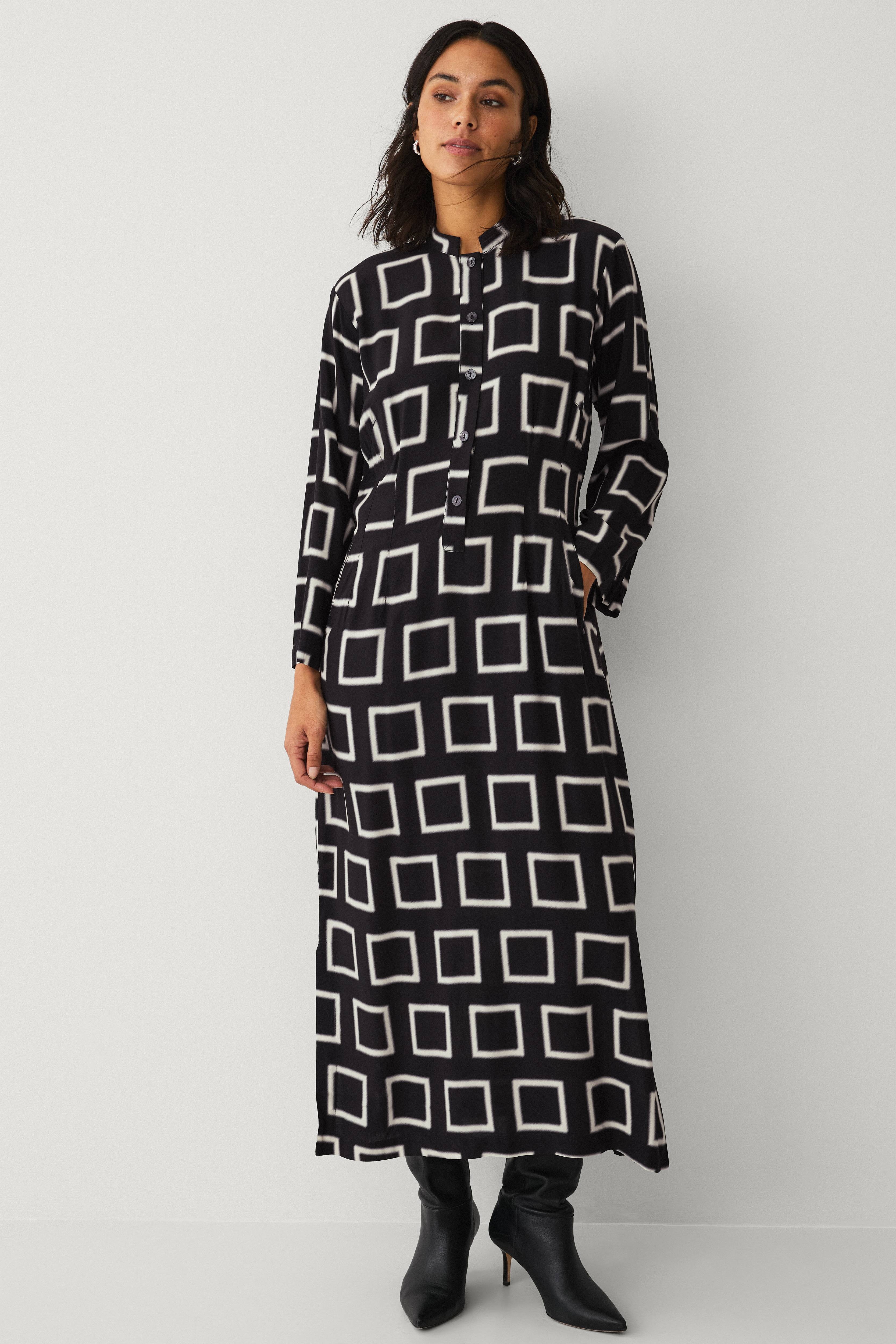 • Mønstret, semitransparent kjole i viskose• Rund halsudskæring med lang knaplukning foran• 3/4 lange ærmer• Sidelommer• Model med svaj• Længde: 134 cm i størrelse S