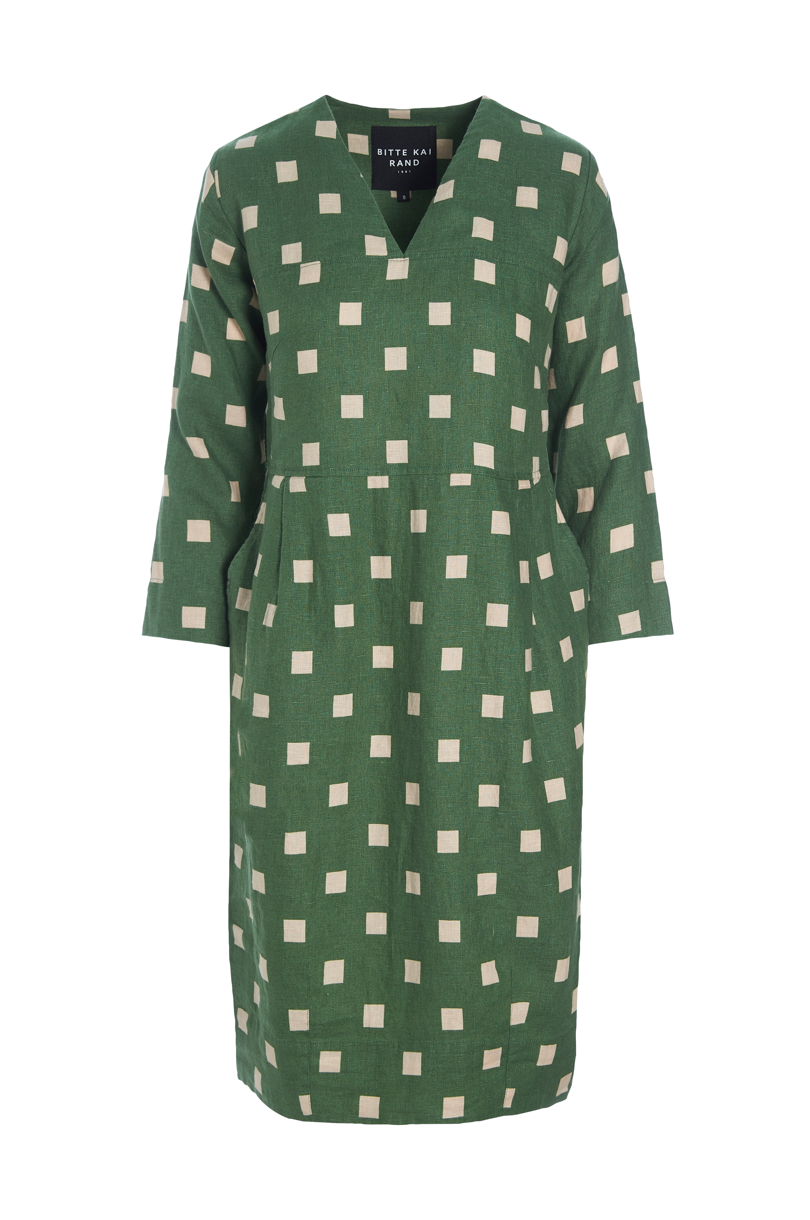 Kjole i hørkvalitet med grafiske tern. V-hals og 3/4-lange ærmer. To lommer. Længde 106 cm i str. XL.