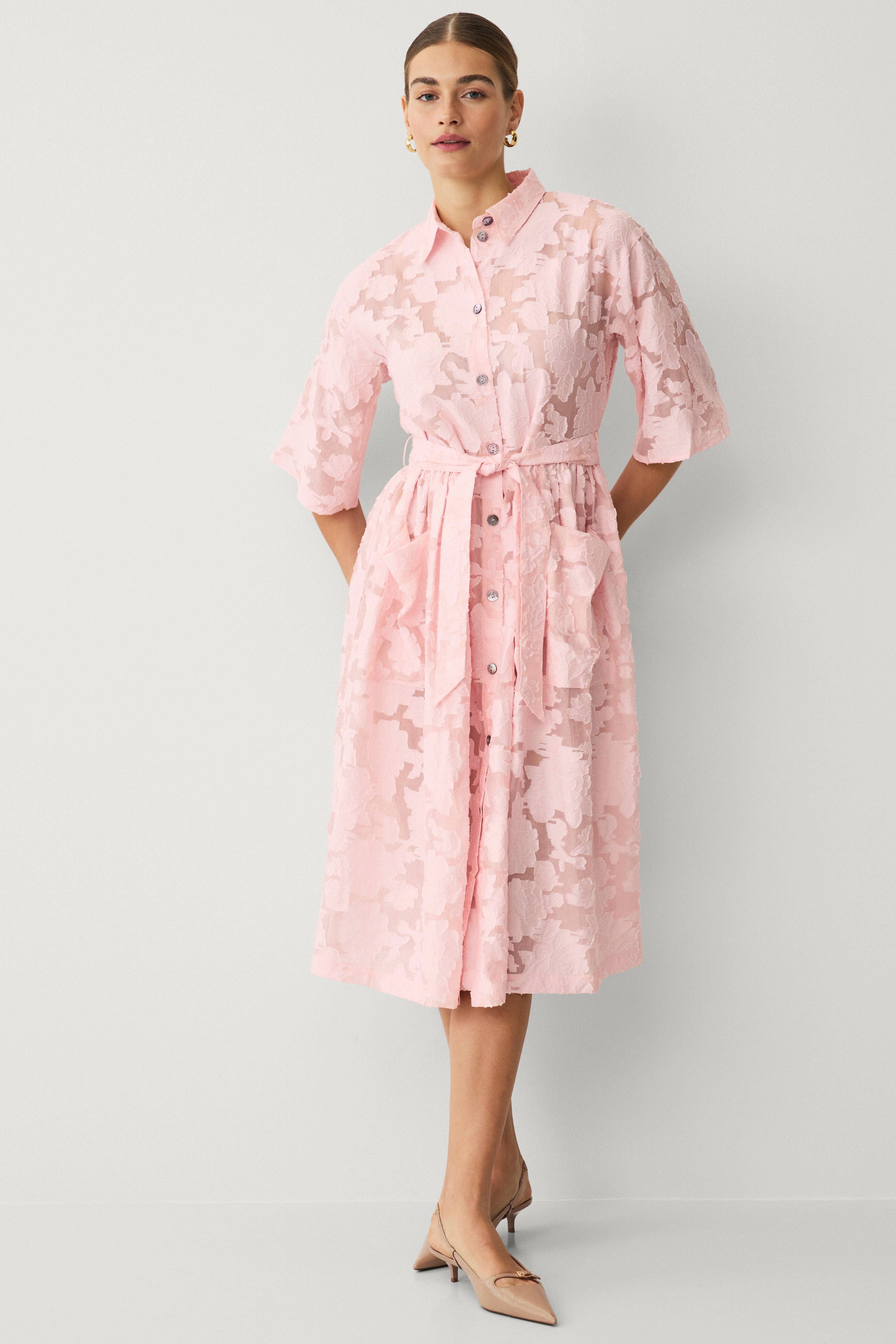• Skjortekjole med svaj med knapper hele vejen frem• Lige, halvlangt ærme• Rynket talje med bindebælte• Påsyede lommer• Længde: 117 cm i størrelse S