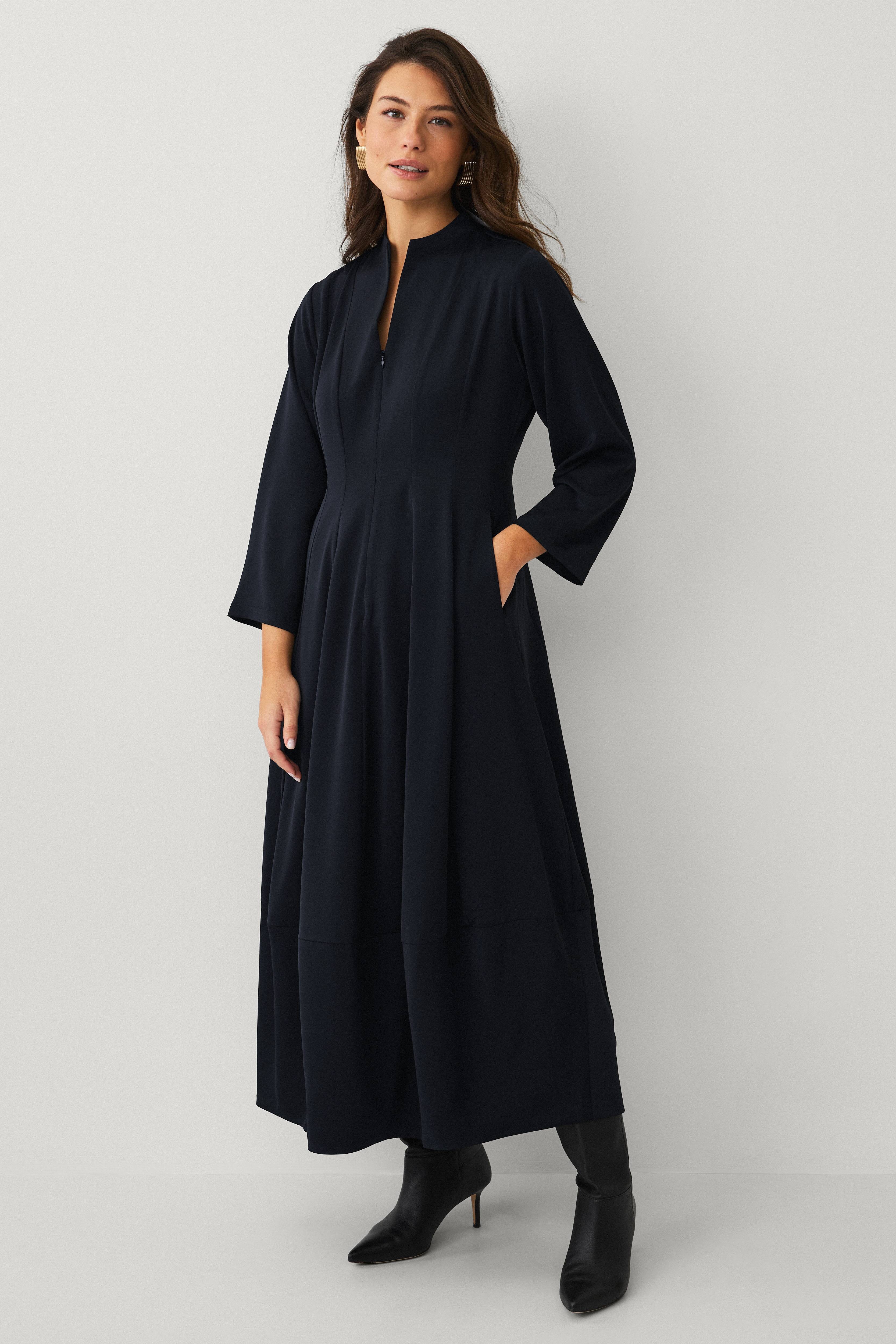 • Lang, skinnende kjole• Afrundet udskæring• Slids foran• 3/4 lange ærmer• Lynlås• Dekorative folder• Sidelommer• Længde: 132 cm i størrelse S