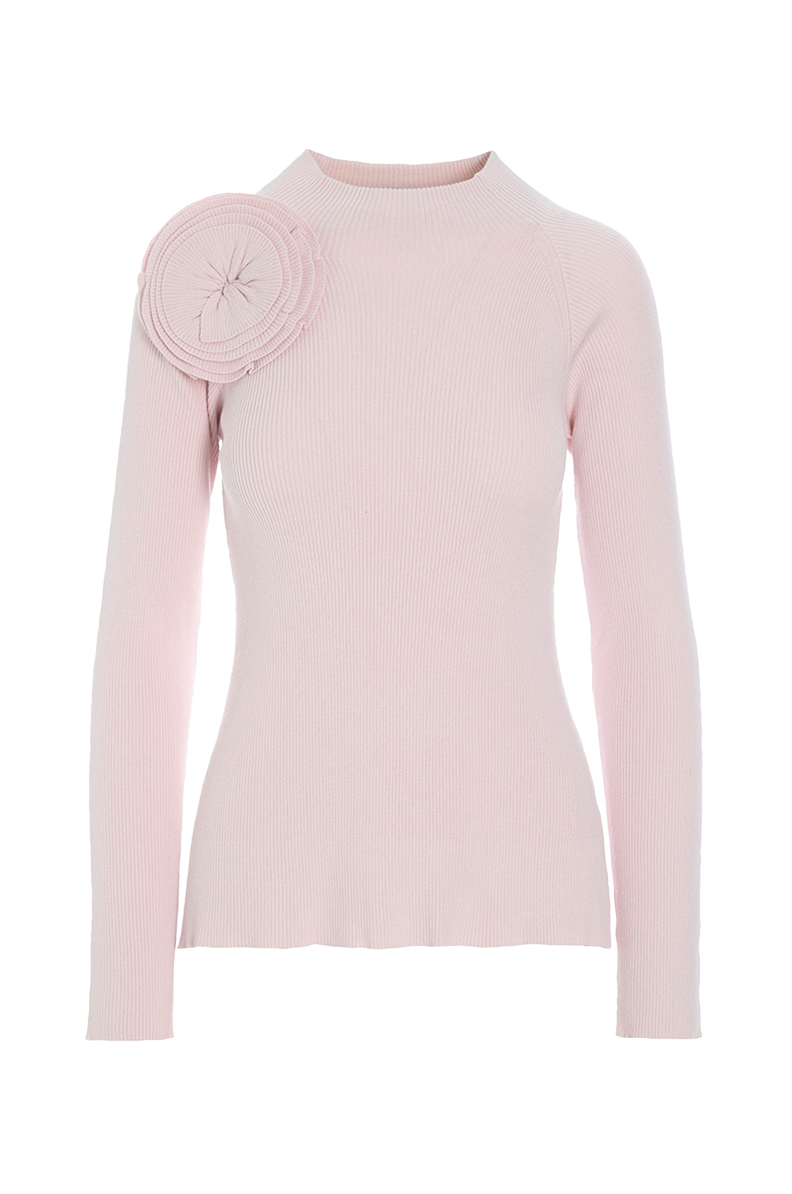 • Figursyet, ribstrikket model• Halvhøj krave• Langt, lige raglanærme• Stor, blomstret applikation på en skulder